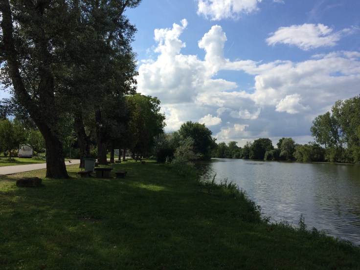 Both very tired, we had a few stops for food, coffee and fresh air and decided to change our plans. Rather than sightseeing in the wall town of Beaune, we decided we’d rather just relax, read a book or watch a DVD and have an early night. I found a motor home aire by a river where we are now having a beer in the sunshine in a small town called Louhans.