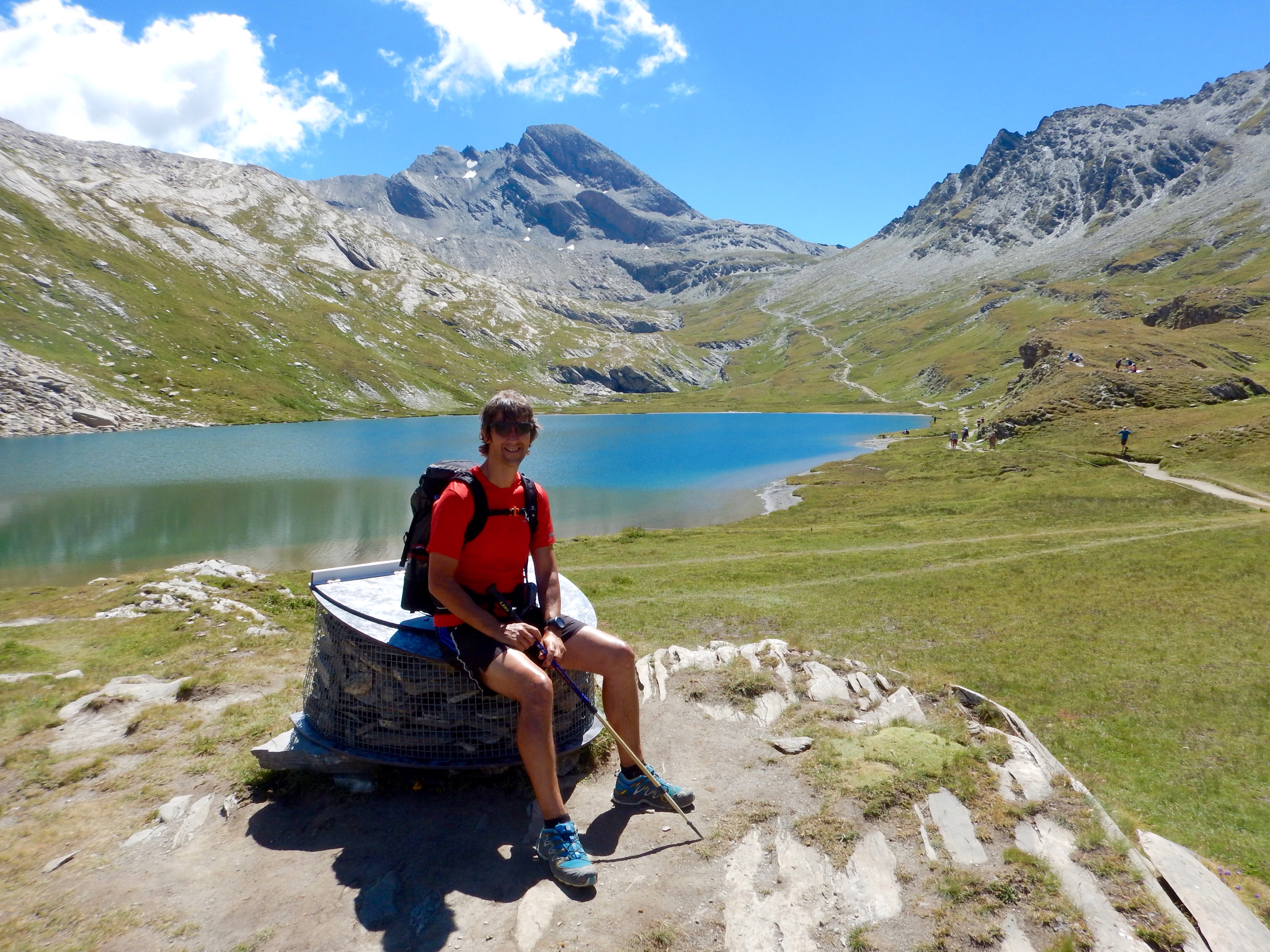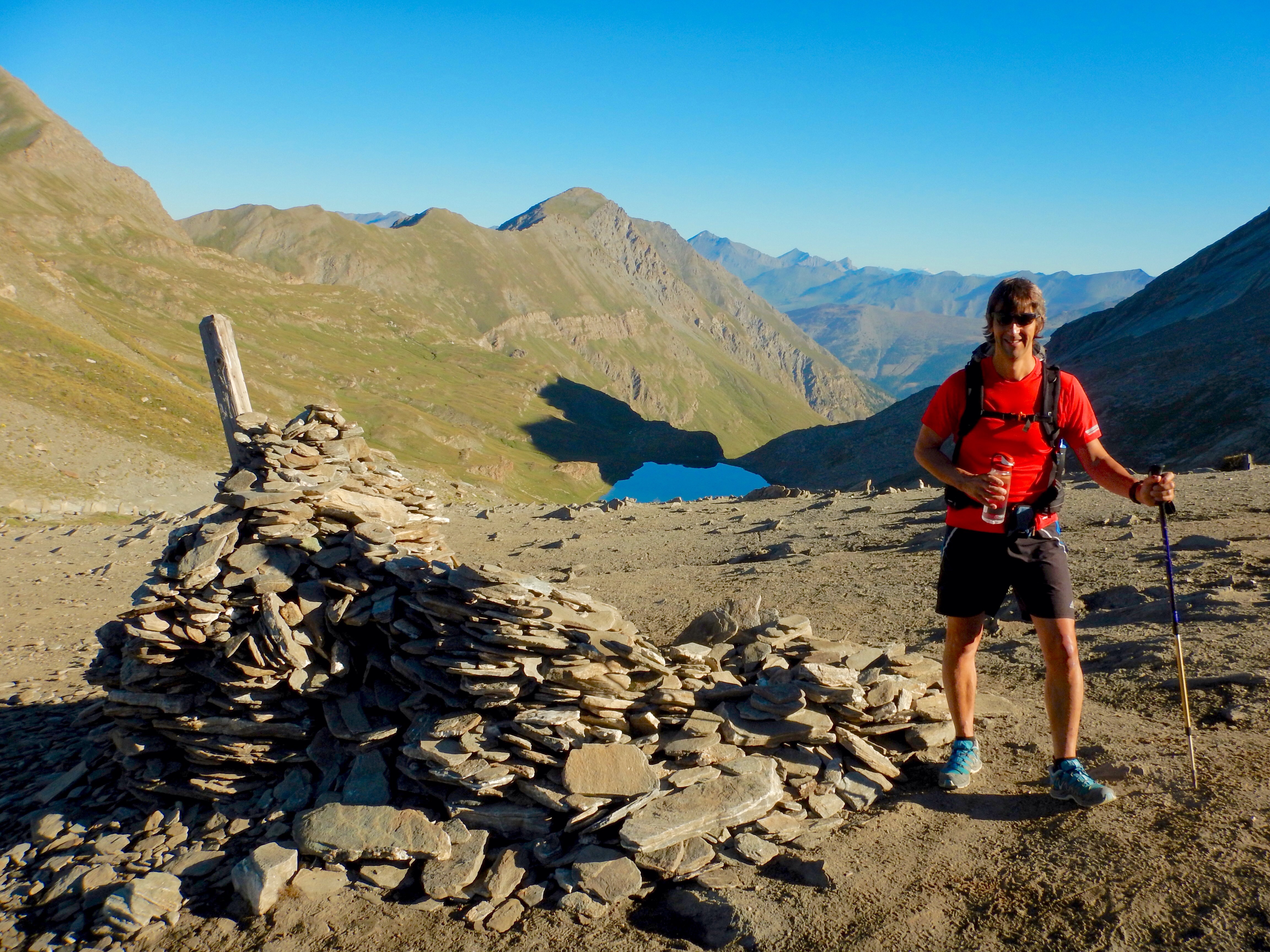 We retraced our steps back to the col, having an argument at one point because I’d picked the wrong way and we could no longer see the red markers. I was now carrying the pack (we’d left one at the refuge) and was reluctant to climb back up!