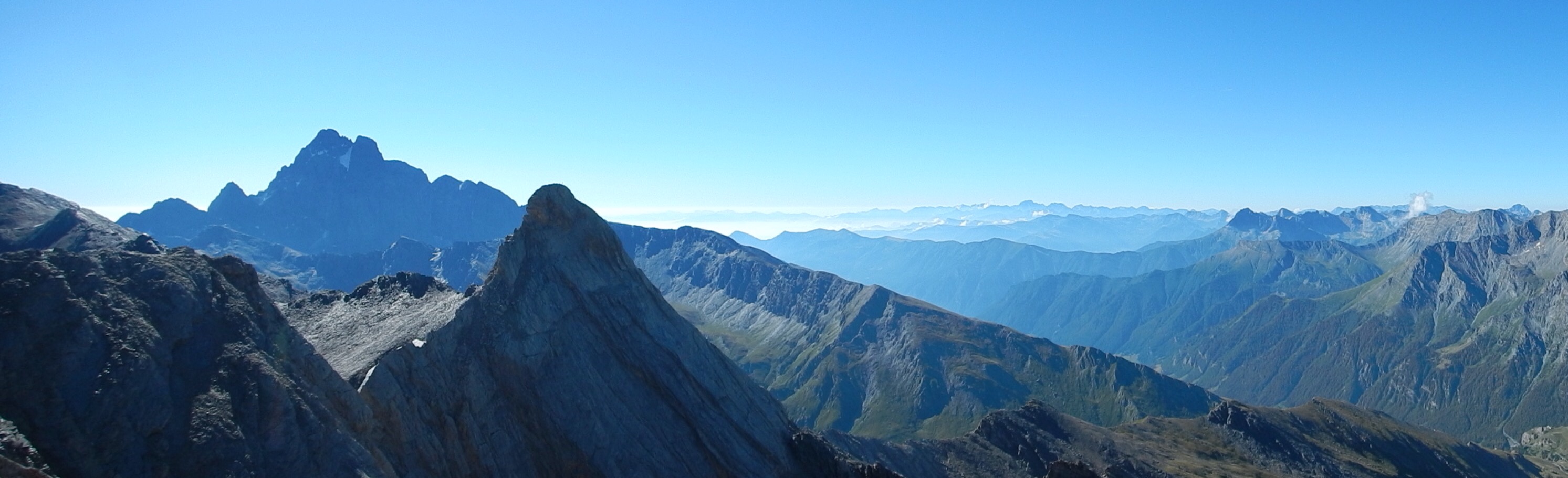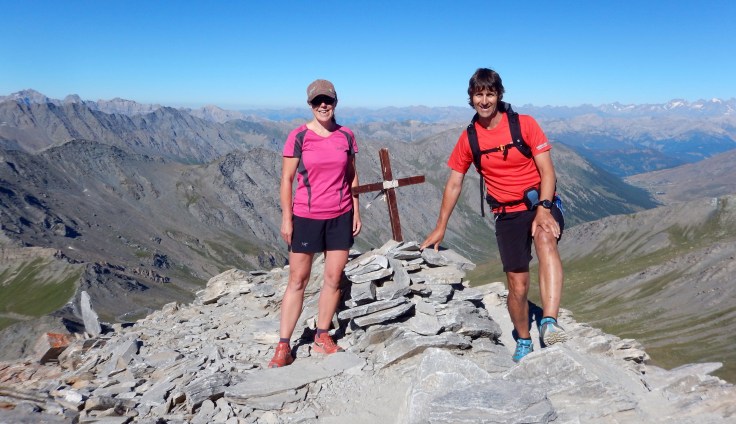 As we climbed further, the views became better and better, the terrain became steeper and rockier, and we had to look carefully for the red marks showing the best path. Finally, we reached the summit and some Italians pointed out the neighbouring peaks, including Mont Blanc, Gran Paradiso and Monte Rosa, many miles away. Stunning!