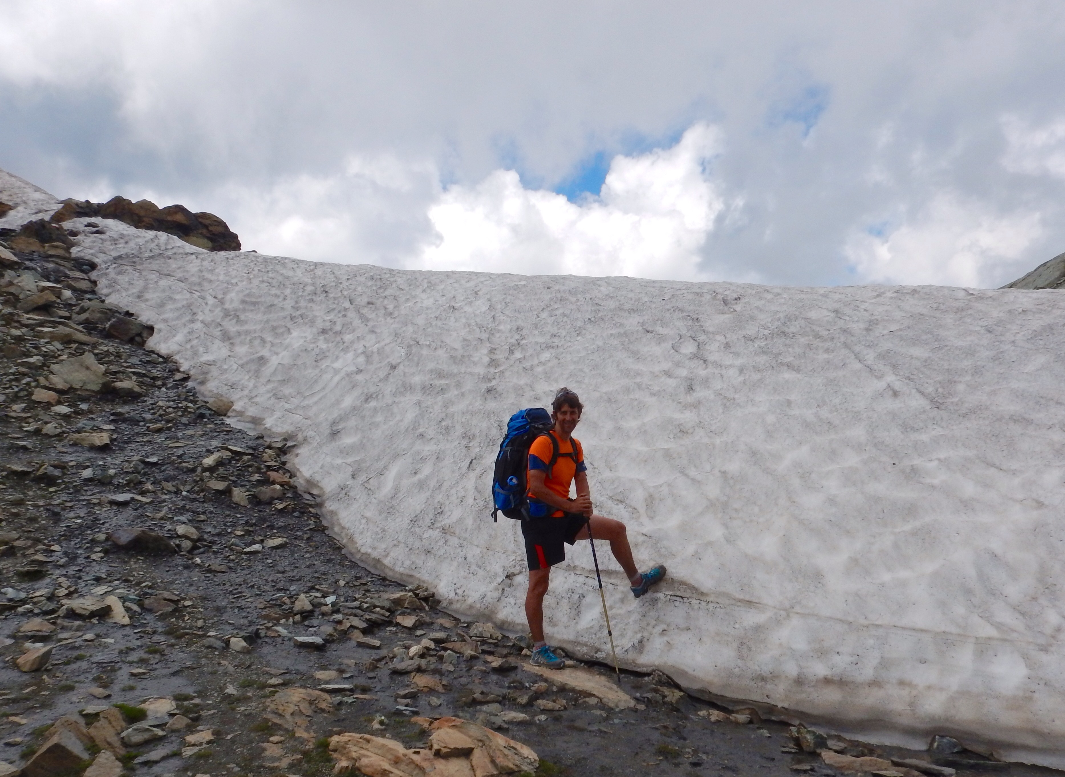 Back at Passo della Losetta, we carefully checked our route, a bit confused because we’d forgotten about Col de Valante (2815 metres), which we’d visit next. We circumvented Pointe Joanne in the shadow of Monte Viso and soon got to the col, with the remains of winter snow.