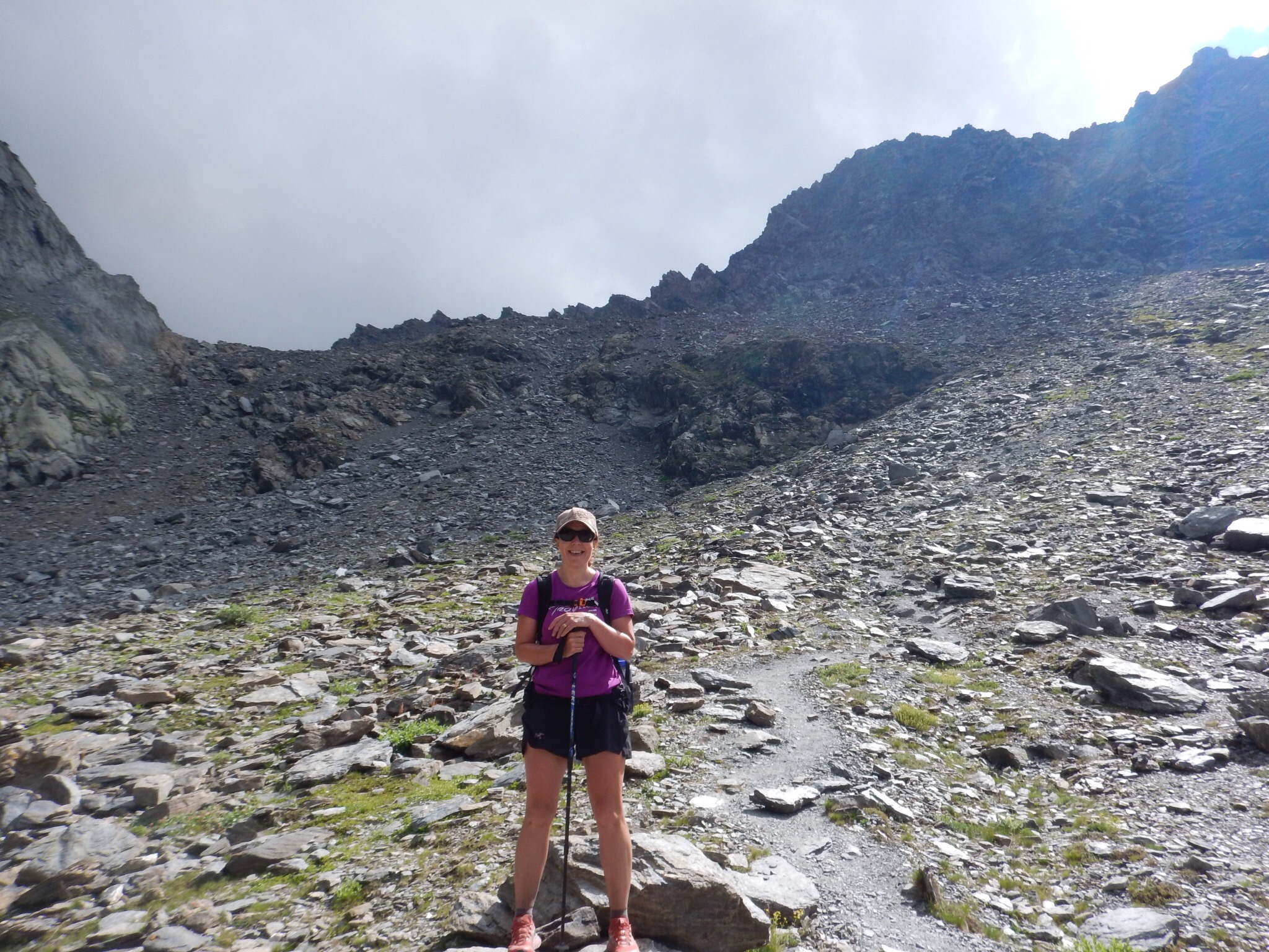 The route down from the col was very tough, across boulder fields and down slippery scree. It’d been a tough day but we dug deep and kept plodding, using our poles to ease our aching knees and help prevent falls.