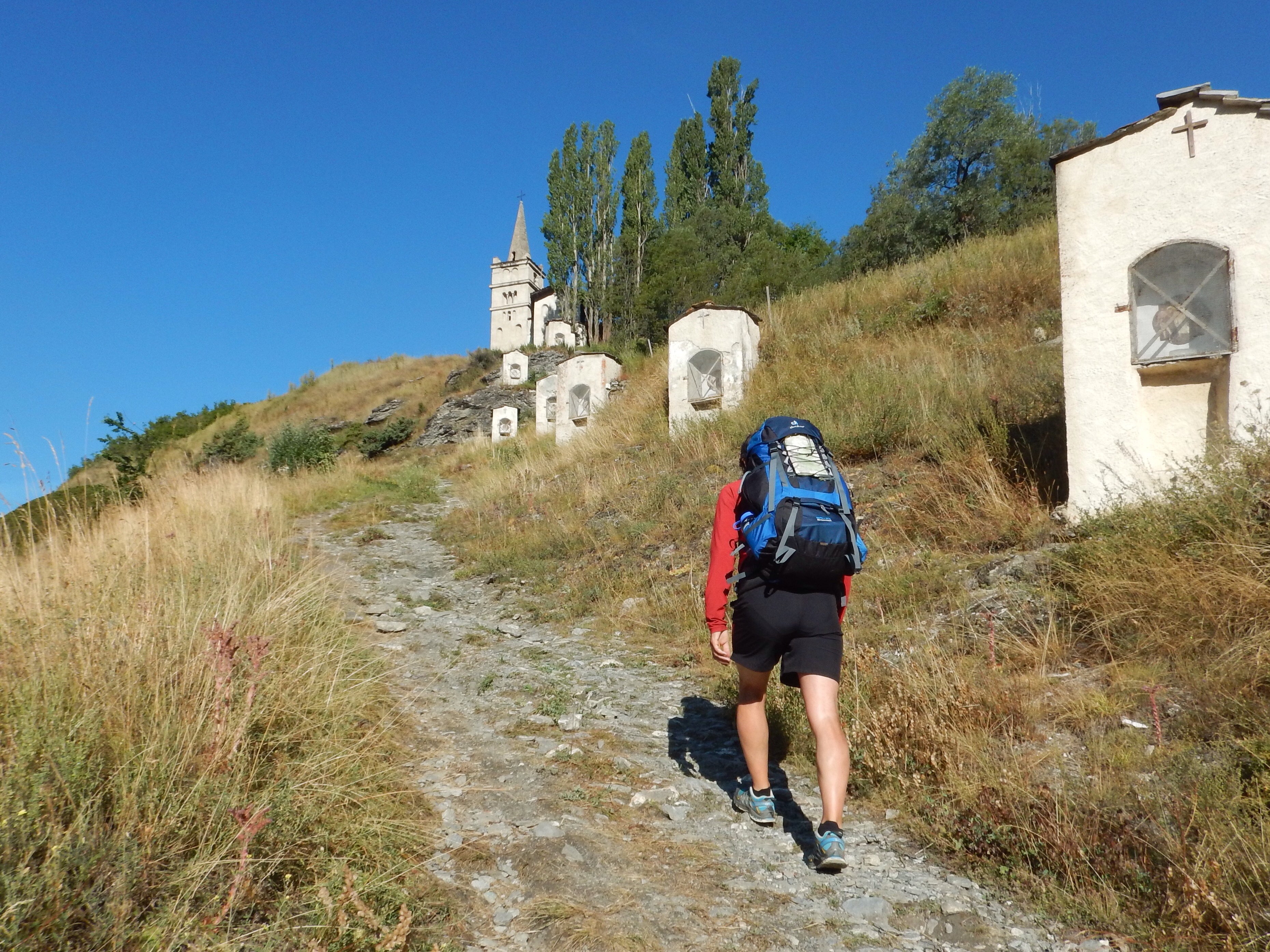 Finally, we started walking, past the stations of the cross and the old church above Abries, winding along the valley and up the hillside then turning alongside a gorge through trees and a deserted hamlet with a small chapel.