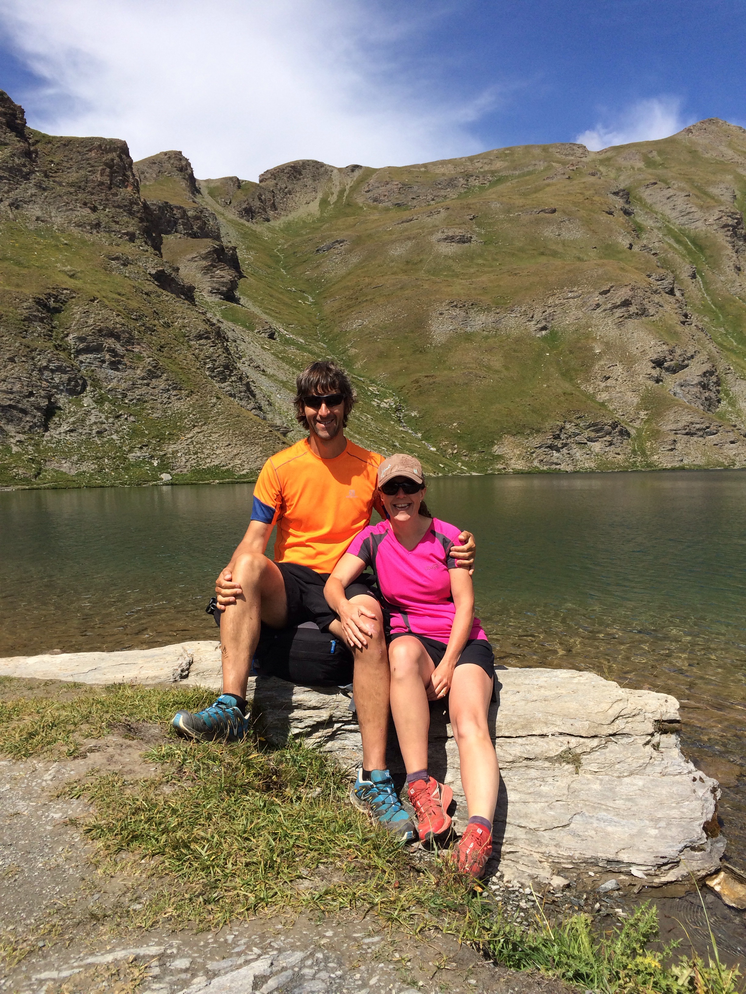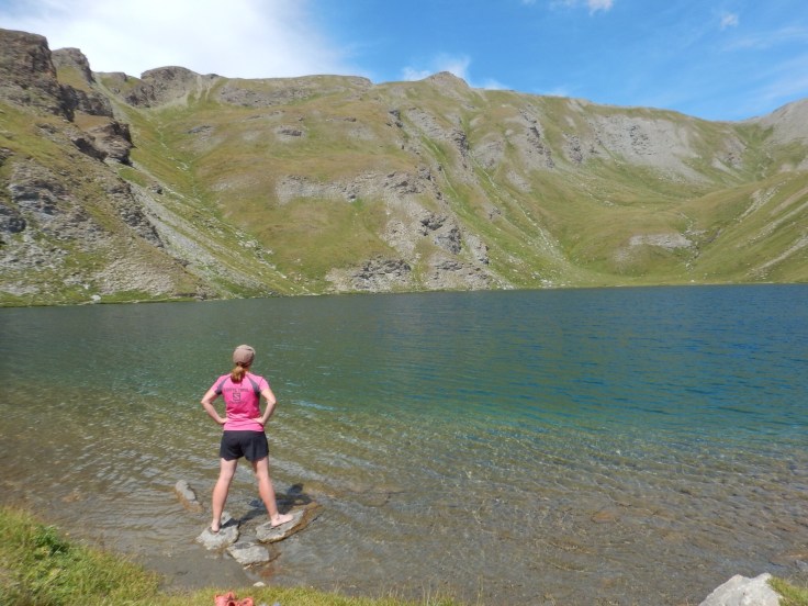 We stopped for a bite to eat on the bridge over the river before starting the relentless climb, zigzagging backwards and forwards up the steep grassy mountain slopes. The climb from the village at 1583 metres to the Lac du Grand Laus at 2579 metres seemed to take forever, probably because my legs were so heavy. However, we made good time and were soon sitting by the lake enjoying the beautiful scenery.