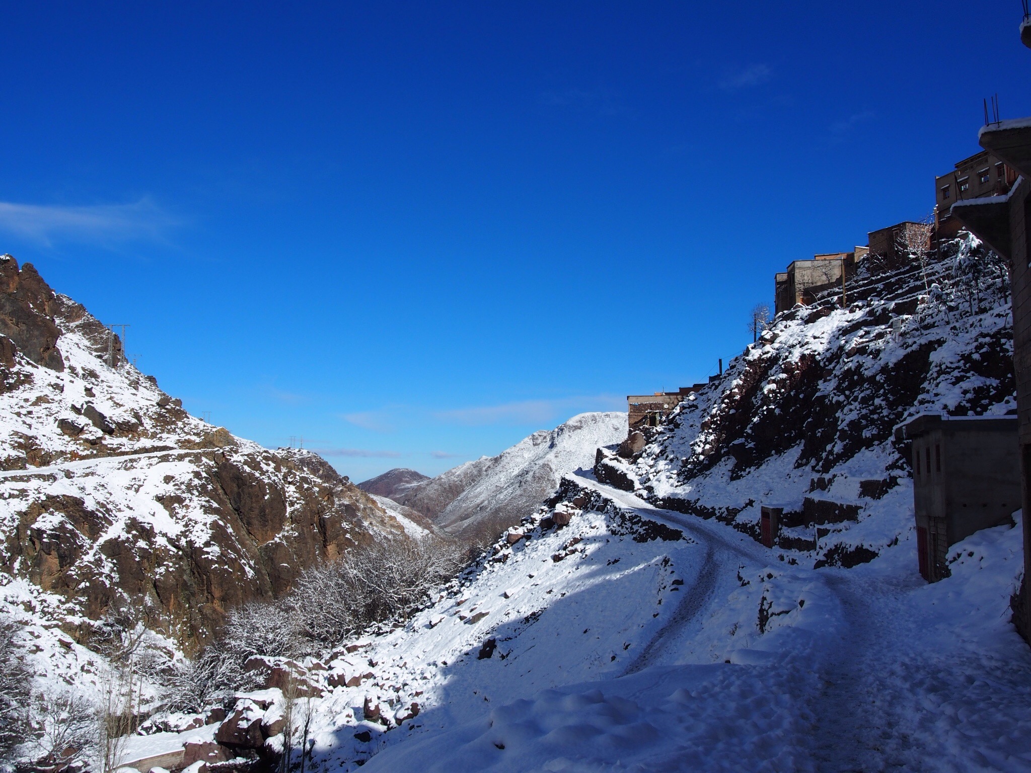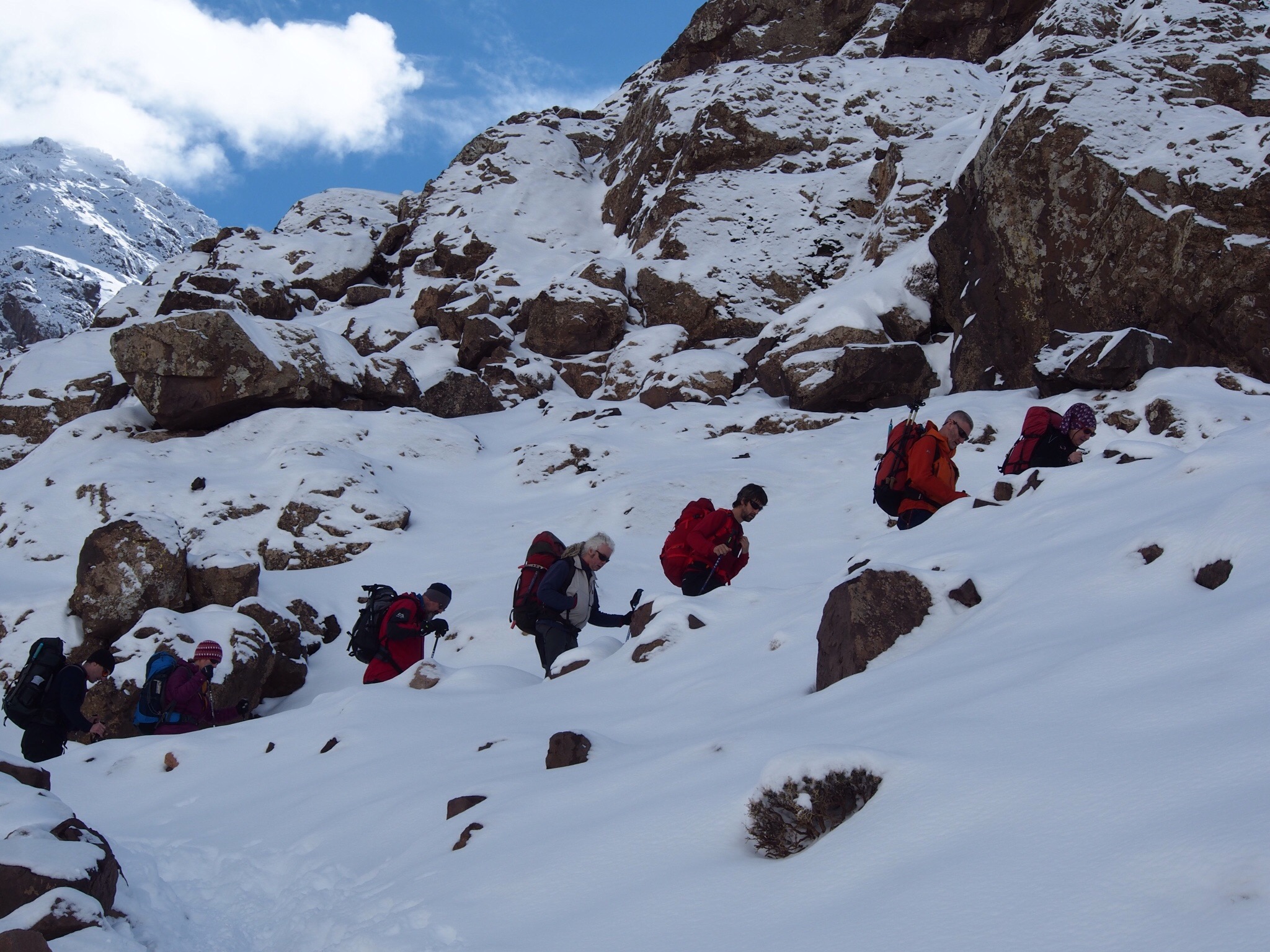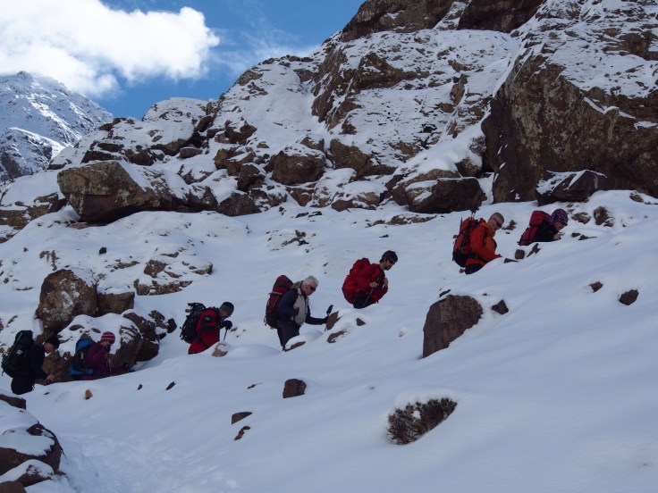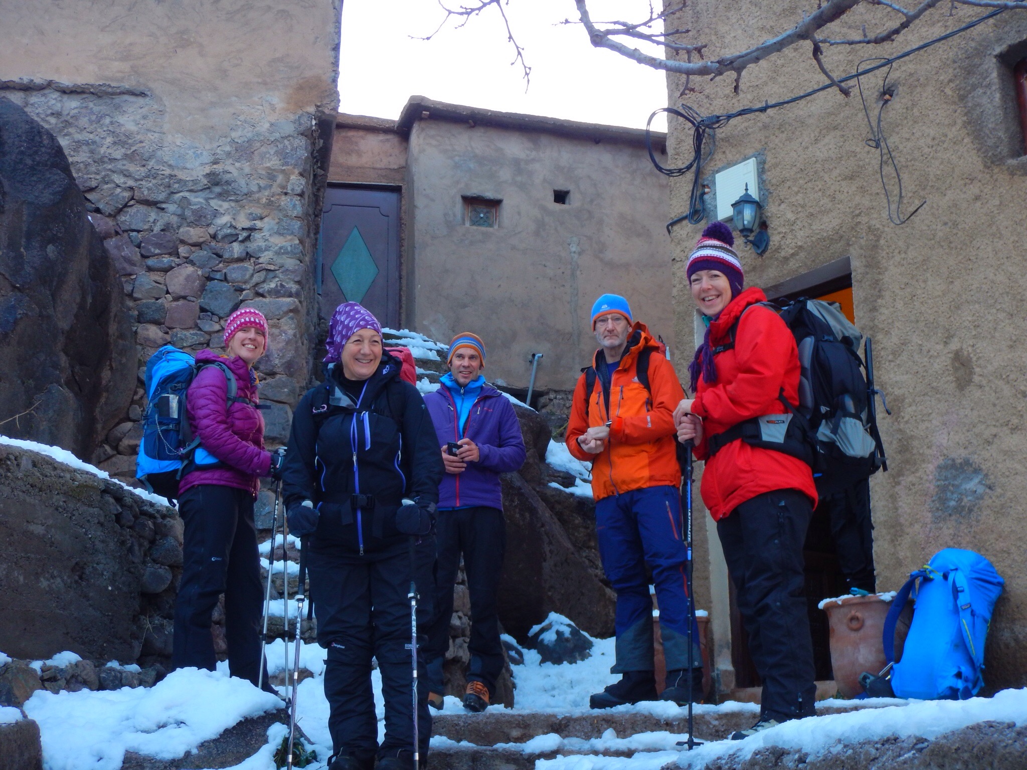 We got up early and had a large breakfast of cereal, yoghurt, bread and jam. Then we filled our flasks and checked our packs, donned coats, hats and gloves and set off to climb from Imlil to Riad Atlas Toubkal high in the Atlas Mountains.