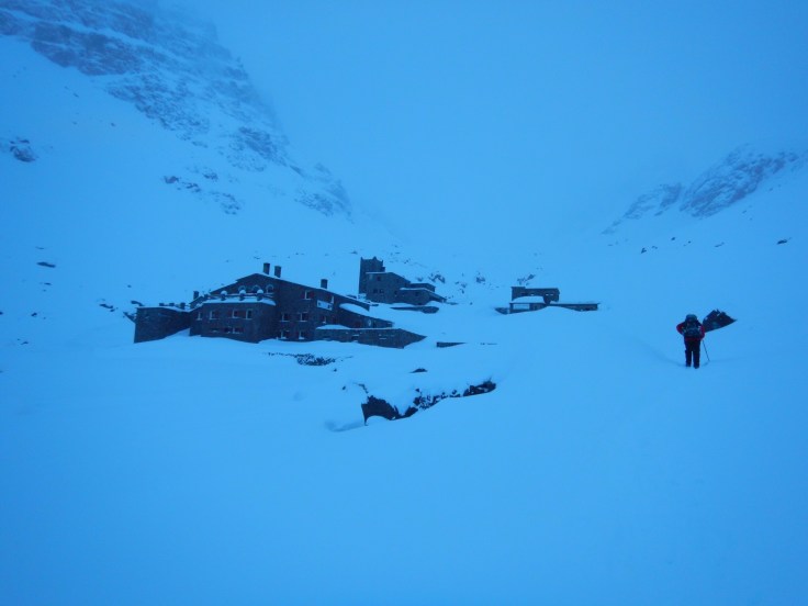 We’d been walking for 8 hours by now and I was starting to struggle, getting slower and slower and suffering with stomach cramps. The hut finally came into view and my spirits were raised and I dug deep and kept plodding. The path disappeared and, at the front, Pete was finding it tough but was determined to keep us all moving because it was very cold and he wanted to try and get us to the refuge before it got dark and even colder. However, at times it felt as though it was getting further away, and a couple of times I was in tears, even though there was no doubt we’d make it.