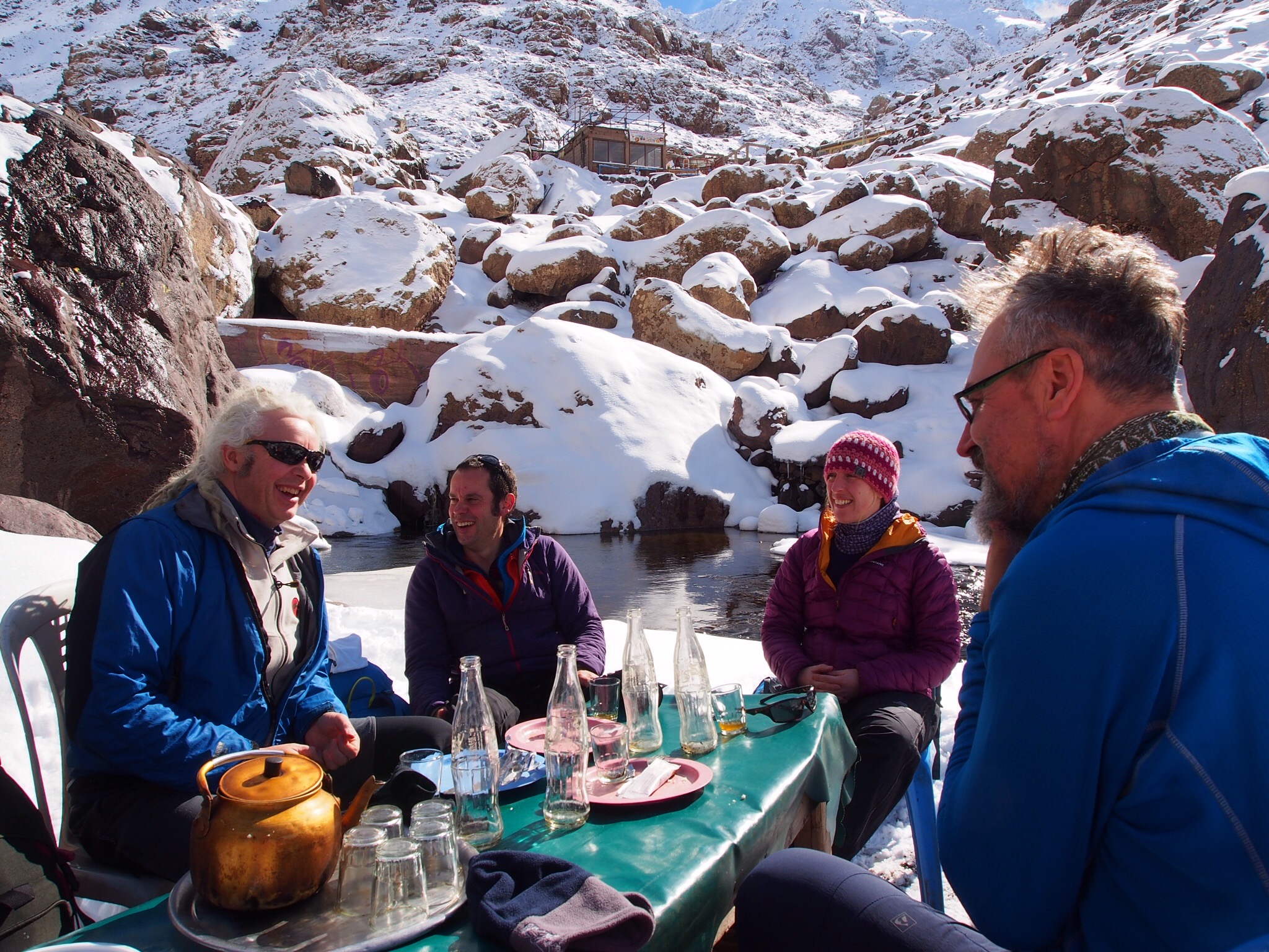 Later, Paul explained the plans for the next day. After today’s long trek, it was to be a later start and a shorter walk, to get used to the altitude and practice using crampons and ice axes, ready for the ascent of Toubkal the following day. He had a device to check our blood oxygen and heart rate, which unsurprisingly had worsened since yesterday after the climb. My oxygen dropped from 94 at 1700m to 88 at 3200m, a level which would be worrying if I’d been at home at sea level, but wasn’t considered abnormal here.