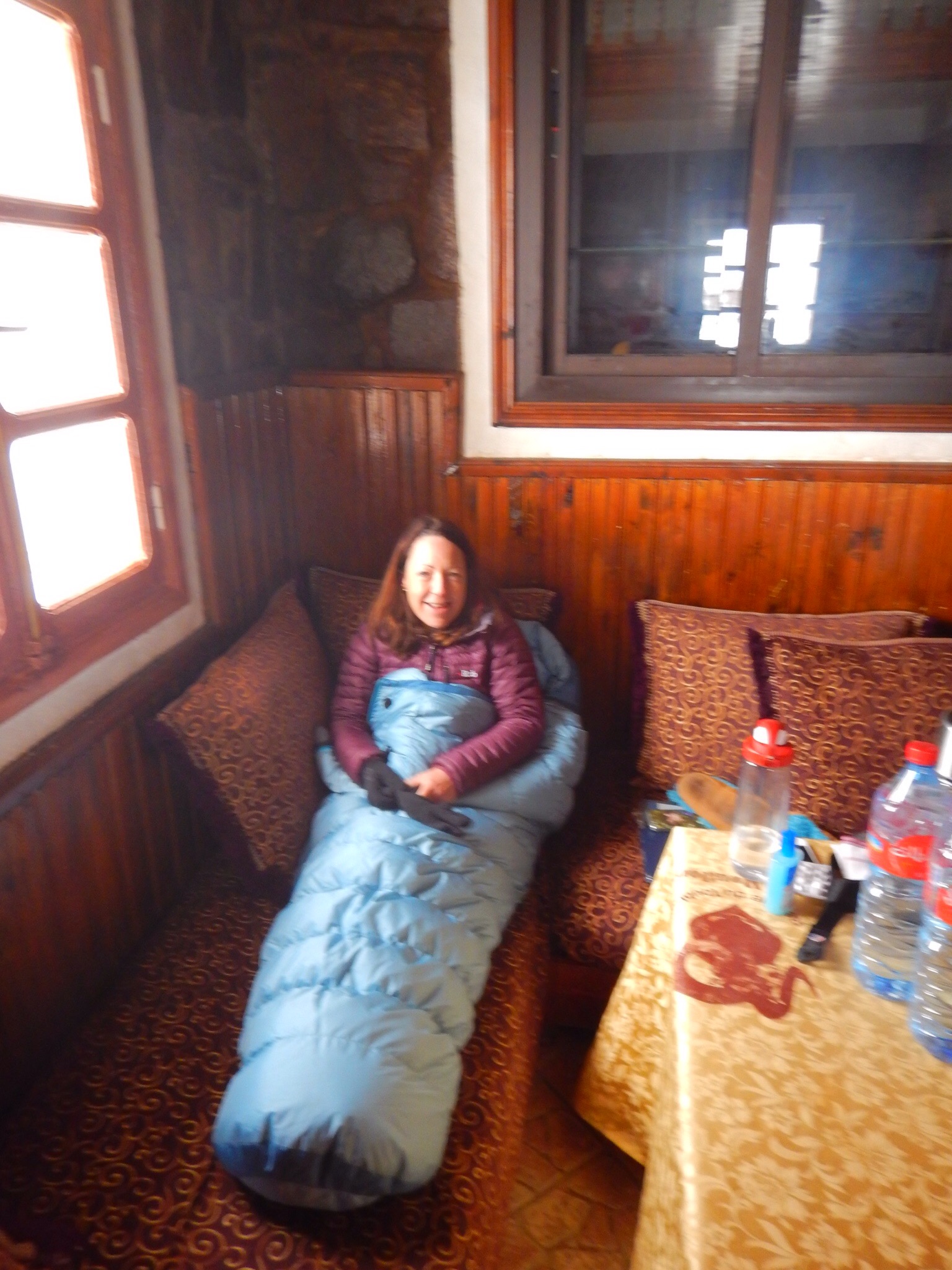 I couldn’t wait for the night to end. I kept waking every every hour or so and struggling to get back to sleep. Although the room was freezing, I was snug in my sleeping bag and my ear plugs reduced the sounds of the others snoring and high altitude farting… A recognised condition! However, as the night went on my head started pounding and, in spite of taking some painkillers, worsened as dawn approached until I also started feeling nauseous. I kept drinking the water that I’d kept by my bed, as we’d been advised the best way to avoid getting acute mountain sickness was to stay hydrated, but it didn’t seem to help.