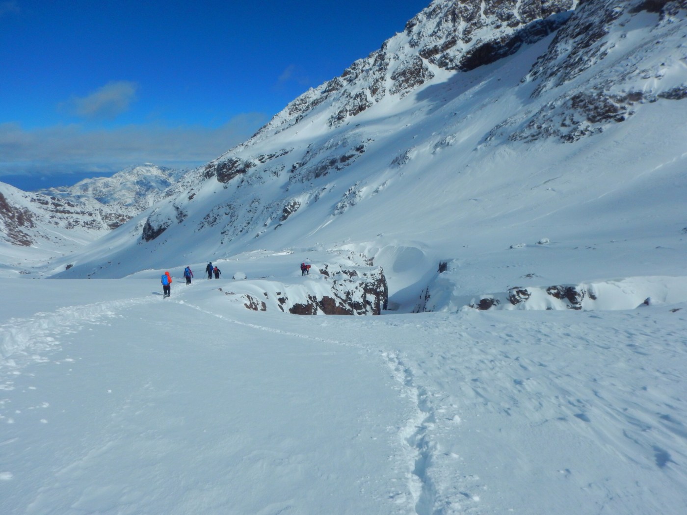 The others went out onto the hill to look at the snow to learn about avalanche risk, but couldn’t do any ice axe or crampon work because the snow was too deep and powdery after the previous day’s snowfall. A group of Australian lads who had tried to ascend Toubkal came back after giving up for the second time because the snow was too deep. Their preparation was less than ideal. One of them had nasty burns on some of his fingers from slipping and touching the fire the previous night.