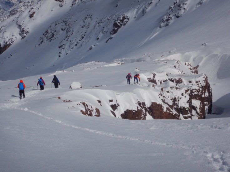 We’d been told to tell Paul or Pete, our mountain leaders, if we had any symptoms of acute mountain sickness so I told Paul. We dressed and went down stairs, then looked at my symptoms against a scoring system that showed I had a mild to moderate dose of the condition. We decided I’d stay put and take some more painkillers and try and stay hydrated while the others had breakfast and went out to practise some winter skills. I was worried that I wouldn’t be able to climb Toubkal if I hadn’t practised my ice axe arrest but was told not to worry about that. Pete would come back at lunchtime to see how I was and we could maybe do that in the afternoon.