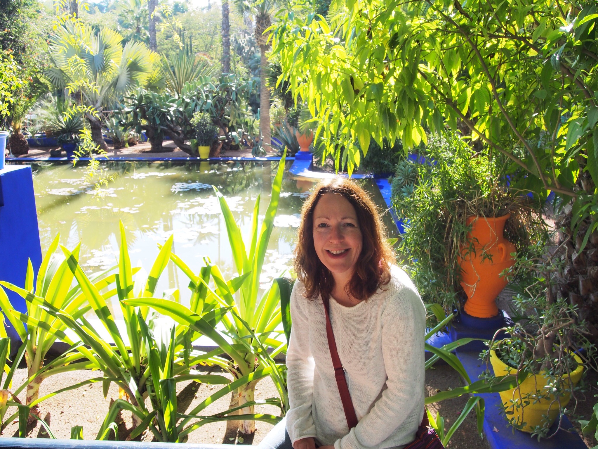 After breakfast, we caught a taxi to the Majorelle gardens, quite an experience because the roads are chaos, with cars, motorbikes, bicycles and horse-drawn carts all weaving around each other, vying for position. The roads around the gardens were being dug up. How we didn’t get run over by a digger getting to the entrance, I don’t know. No health and safety here!