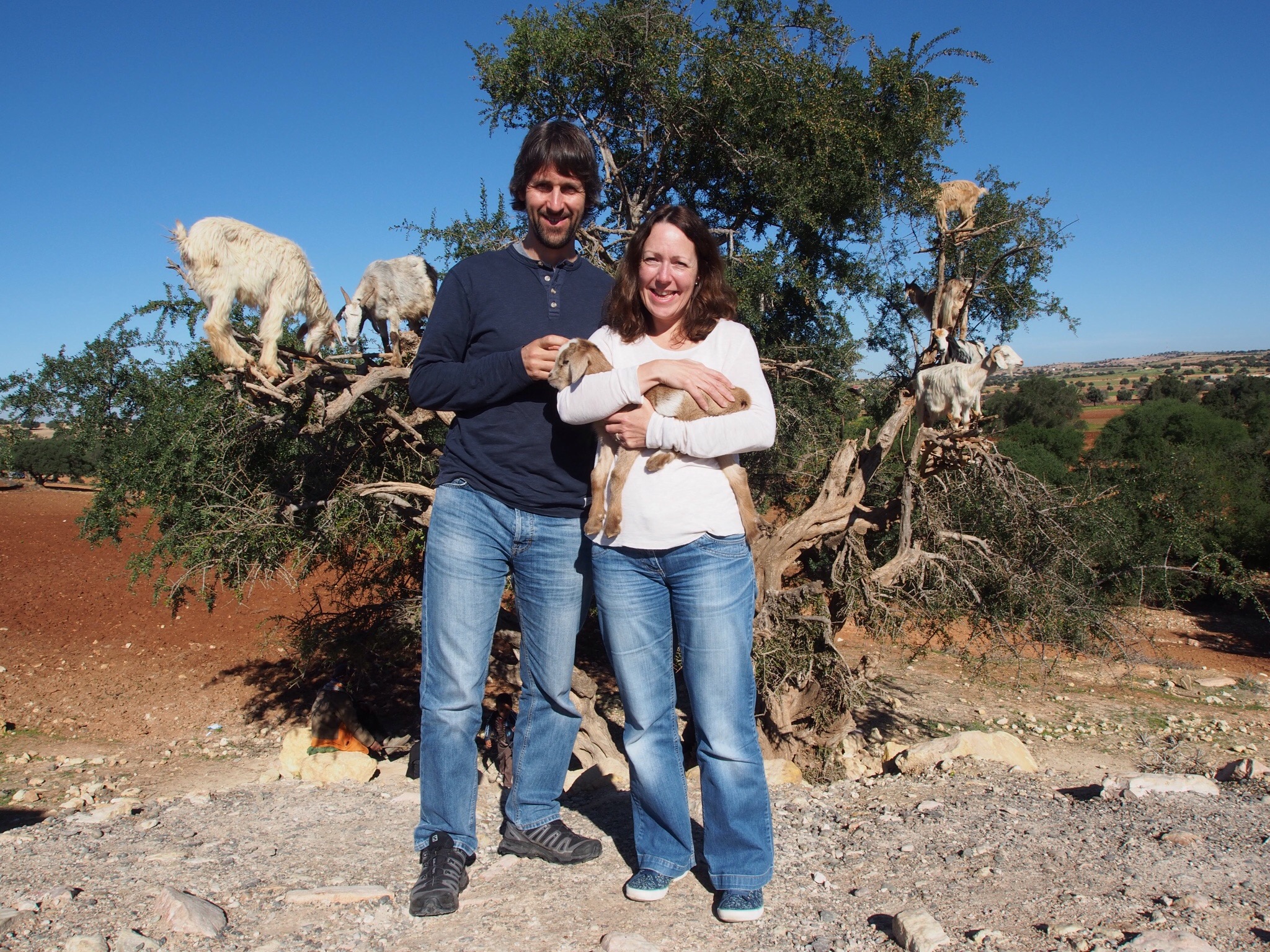 After we left the town, the landscape was flat, barren desert, wandered by sheep with their shepherds then, after an hour or so, rolling hills appeared and the ground was a little greener. The snowy Atlas Mountains provided a stunning backdrop. When we got nearer to the coast, there were argan trees, from which argan oil is produced, and which only grow in this area. Some of the trees were full of goats and the driver stopped for us to take a look. I was handed a baby goat and John was charged for the privilege! At the next stop, a viewpoint over the coast and Essaouira, he refused to pay to have his picture taken with a camel!