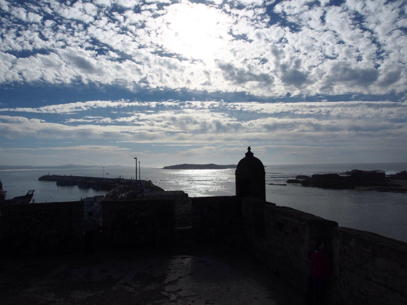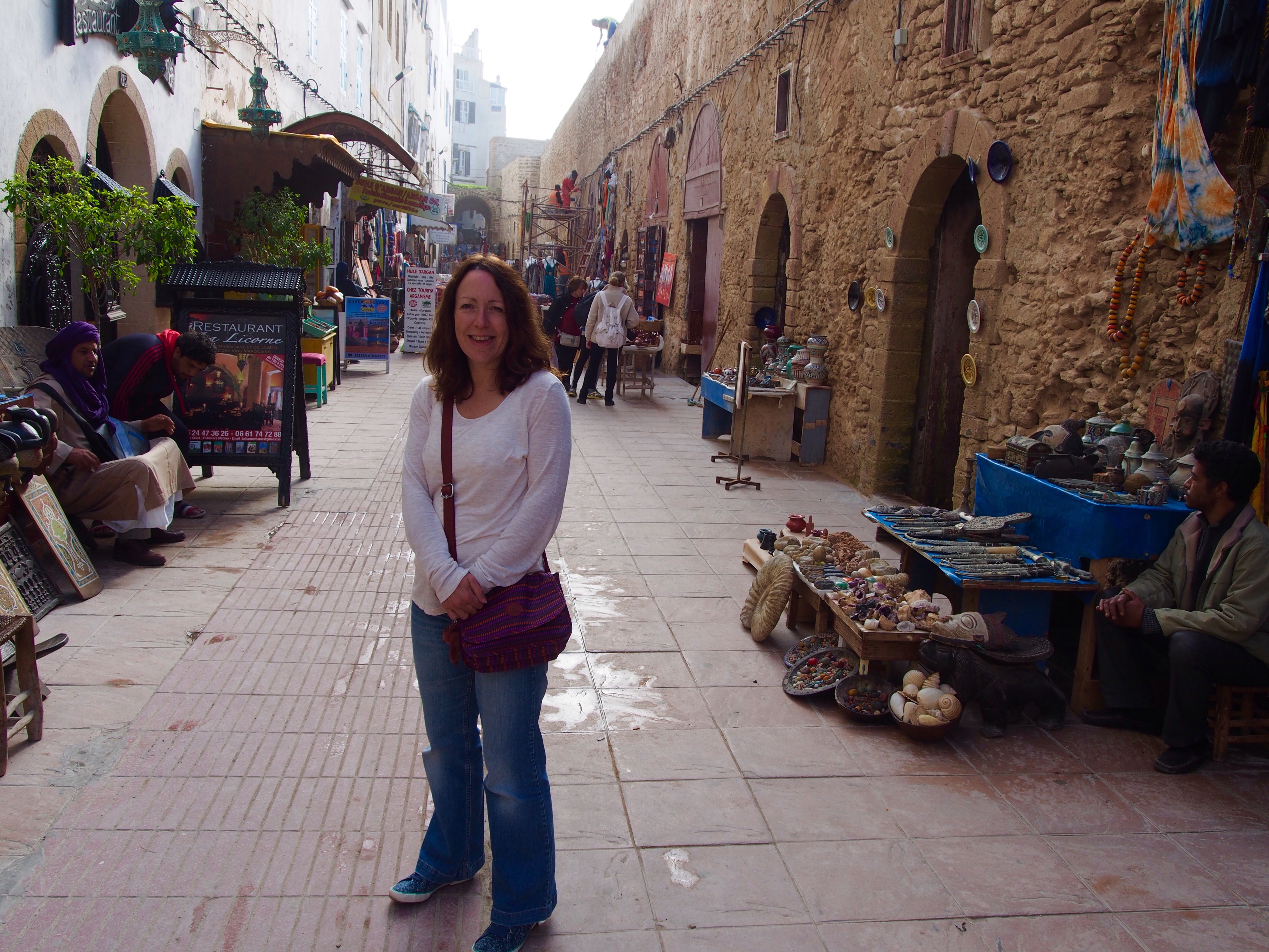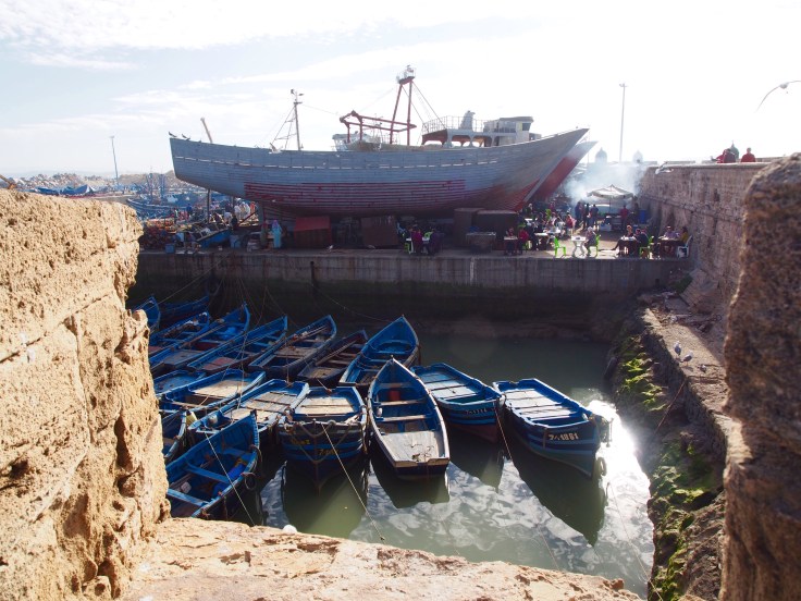 When we arrived in Essaouira, we wandered through the medina. It was much quieter and more relaxed than Marrakech, with fewer people approaching us to sell their wares, and fewer shouts of ‘special offer for you!’ but similar goods were on sale… Mainly pottery, leather and wood. The beauty of the town also attracts artists so there were lots of galleries of paintings, and there is a fish market, with all sorts of sea food on sale.