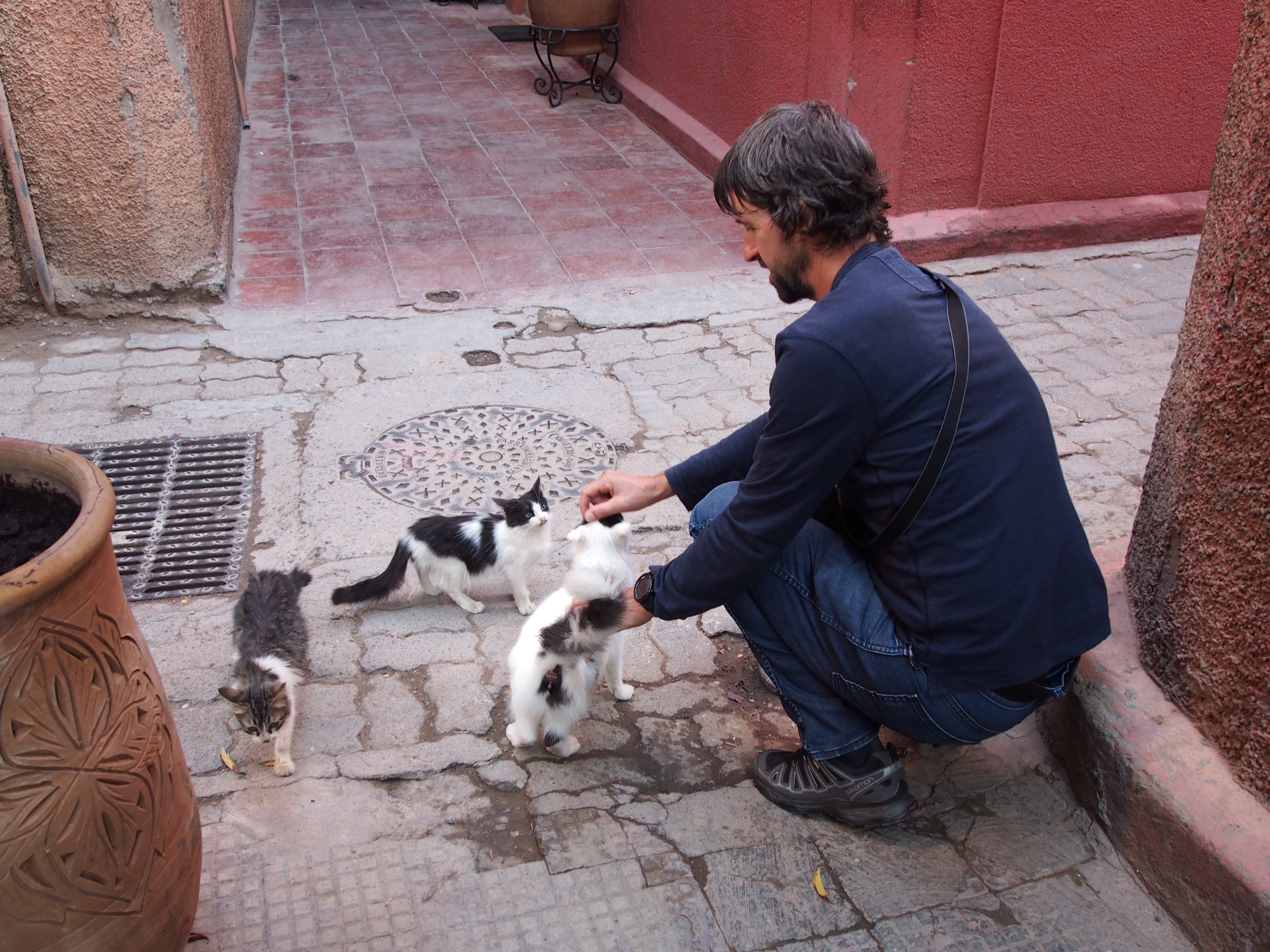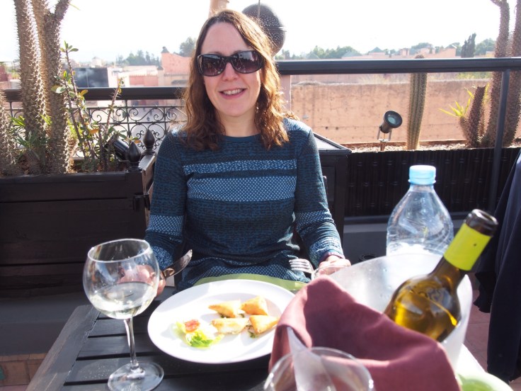 When we’d changed we went up to the rooftop Kosybar for lunch and a bottle of wine. As Morocco is a Muslim country, only bars and restaurants with a predominantly foreign clientele are allowed to serve alcohol. We didn’t look our best for our Christmas lunch, with the remnants of massage oil in our hair, but at least we didn’t see anyone we knew, and won’t see anyone again! My choice of meal wasn’t the best either… Although my goats’ cheese starter was lovely, my main course salad was full of mushrooms…eugh!