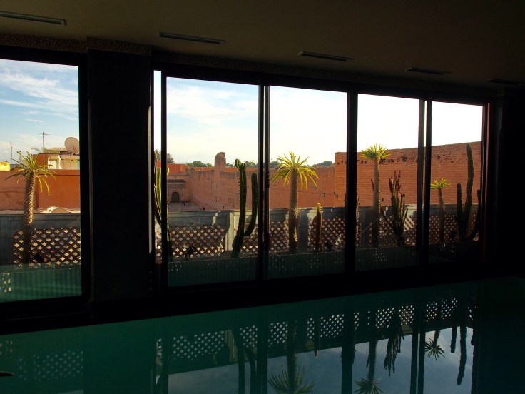 Then, after drying ourselves and putting dry paper knickers on, it was time for our massages. We were taken to yet another room, with dim lighting and piped music, and comfortable massage tables where we lay draped in towels. We were massaged from toe to head, front and back, and it really was the most relaxing massage I’ve ever had. The spa experience finished sitting, relaxing by the pool, drinking mint tea and enjoying views towards the mountains, watching the storks on the palace walls.