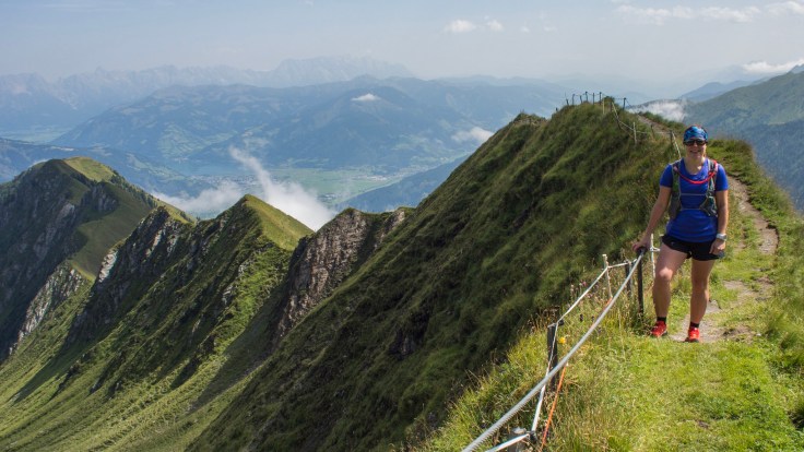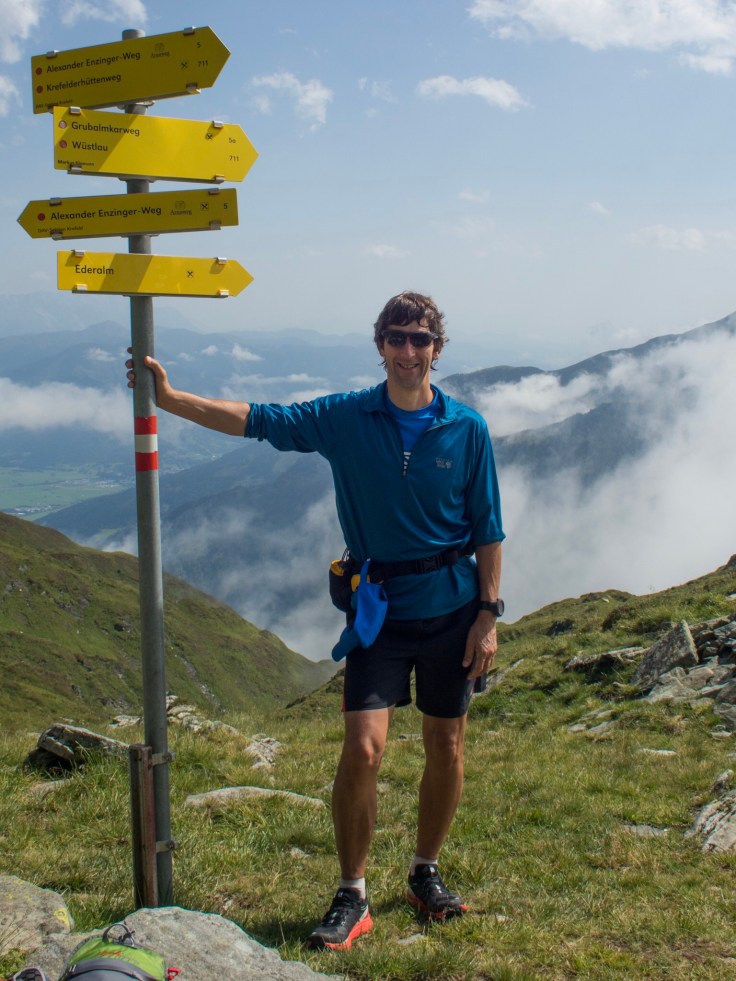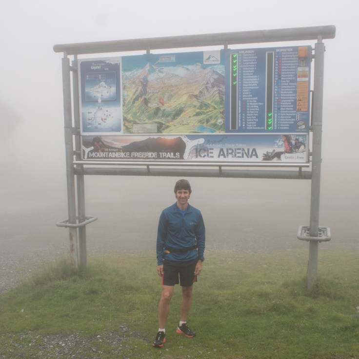 We decided to set off, down to the lower lift station, via the Krefelder hut. There, I'd hoped to climb a peak that looked pretty cool in the guidebook but we missed it completely in the cloud! We passed the lower lift station and joined the track to climb up to our main route for the day, the Alexander Enzinger-Weg, a lovely ridge walk and very runnable.