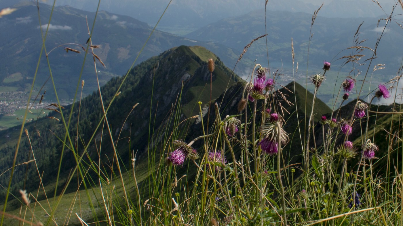 We continued uphill on our path, shooing flocks of sheep with floppy ears and thick coats out of the way. Finally we reached the ridge and the first 2000m peak. Another wow! The guidebook had said it was a lovely walk but we weren't expecting such a great ridge walk, with breathtaking views in every direction. The mountains dropped steeply to either side, covered in bright green grass and wild flowers. And the path was perfect for jogging, although we had to careful not to lose our footing!