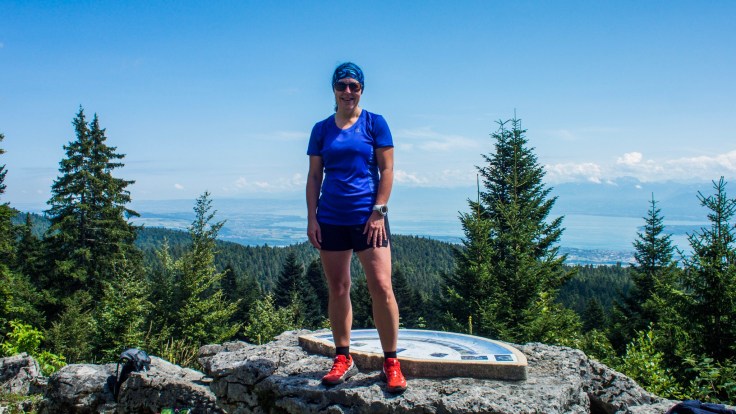 The path started from the back of the campsite and ascended steeply through the forest, crossing forest roads now and again. After several kilometres of climbing I was hot and getting really annoyed at the flies trying to drink my sweat! We decided it was time to stop for something to eat at a view point 5 minutes off our path…La Fenetre du Leman, overlooking Lake Geneva. We couldn’t see the campsite which was hidden, but we could see the lake and town on Divonne.