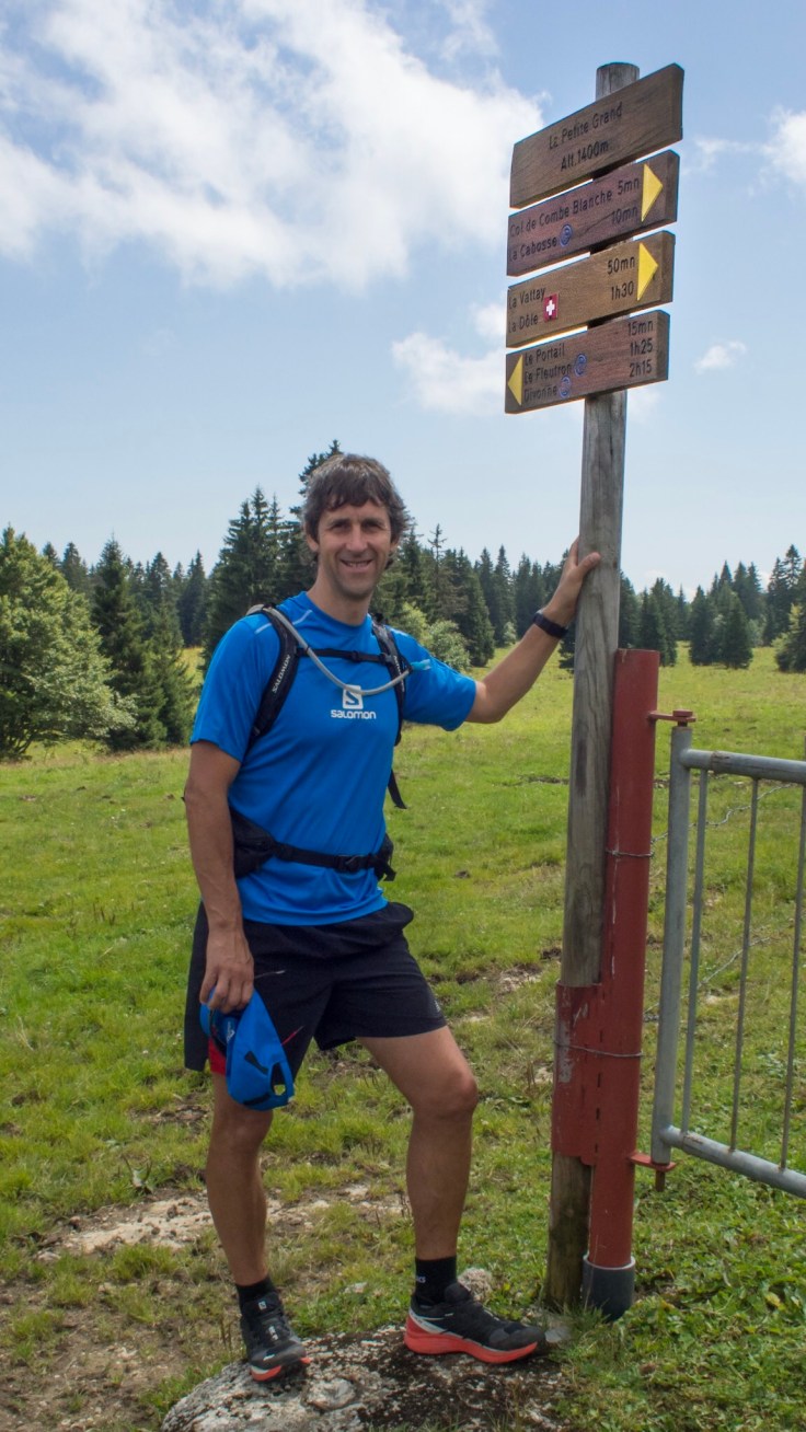 After this, the path became a little less steep, through pastures. We could hear cowbells ringing but the cows were too far away to bother me. Finally, we reached the parking point for people who had driven up the hillside to climb Mont Dole. It was now about an hour and 20 minutes away. We’d made very good time, much faster than the signposts had predicted, and the sky had got a bit cloudier but not stormy, so we decided to go for it. We knew we’d be able to do some running on the way back down so we should get back in plenty of time to shower and cook dinner for Dan and Jackie, who we’ve invited round.