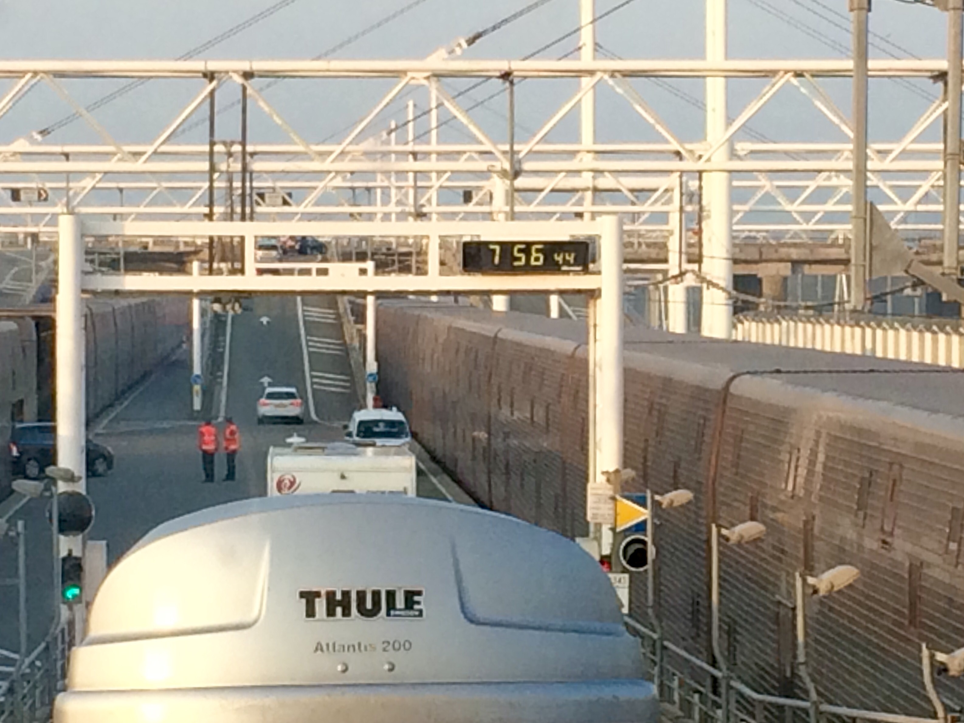 We were woken early by the alarm, pulled our clothes on, put the bed away, and left the aire to travel the 20 minutes to the Eurotunnel terminal. We checked in, collected a coffee and some breakfast and, when our time came, joined the queue to get on the train.
