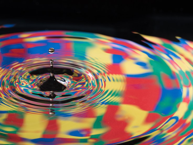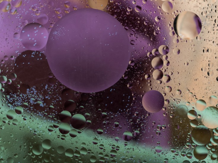 After this I photographed the oil and water, which was just lit using a lamp. I found focussing on the water surface and getting sharp images of the drops of oil difficult for some reason, but I got there in the end with some advice from Eifion. The coloured background in this shot is just some coloured cloths below the bowl of water, which was suspended between two chairs. A simple but effective set up!