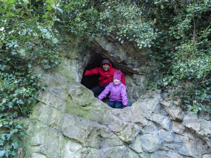 We then climbed the steep steps at the side of the waterfall, passing where the river plunges over the cliff, and entering the woodland behind, carpeted with wild garlic. We then spent some time exploring the caves and tunnels, which we think are old lead mines. Then it was time to play pooh sticks in the river. I don’t know who had more fun… John or Daisy!