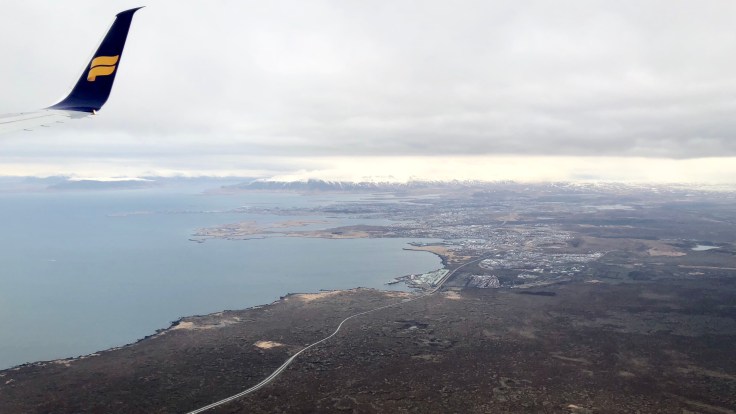The flight was very relaxing. As we watched the hunter in the film speeding along in his snowmobile, I warned John he won’t be allowed to go that fast on our Icelandic trip, and laughed when the FBI agent asked if they could go less than 80mph next time! As we were watching, the film kept stopping for the in flight announcements and we started thinking we might not see the end of the film because the remaining flight time was pretty much the same as the remaining film time. About 30 minutes from the end, John said he’d have to go to the toilet. I’d been wriggling in my seat wondering if I could wait until we were in the airport so I was quite pleased, even though it might mean we missed the end of the film. We paused the film and dashed to the loo and back as fast as we could. Then the announcement came that we would soon be landing, fasten your seatbelts. Come on film! Thankfully, it finished soon after the coast of Iceland came into view, about 5 minutes before we landed at Keflavik airport.