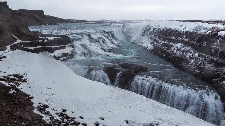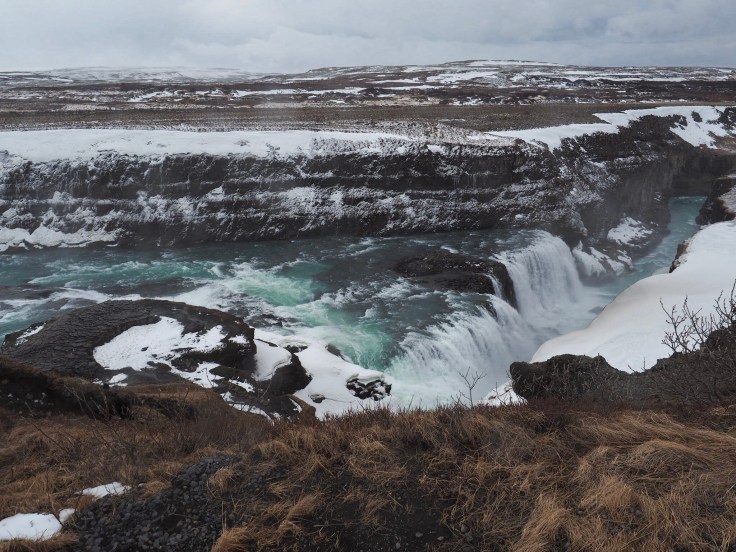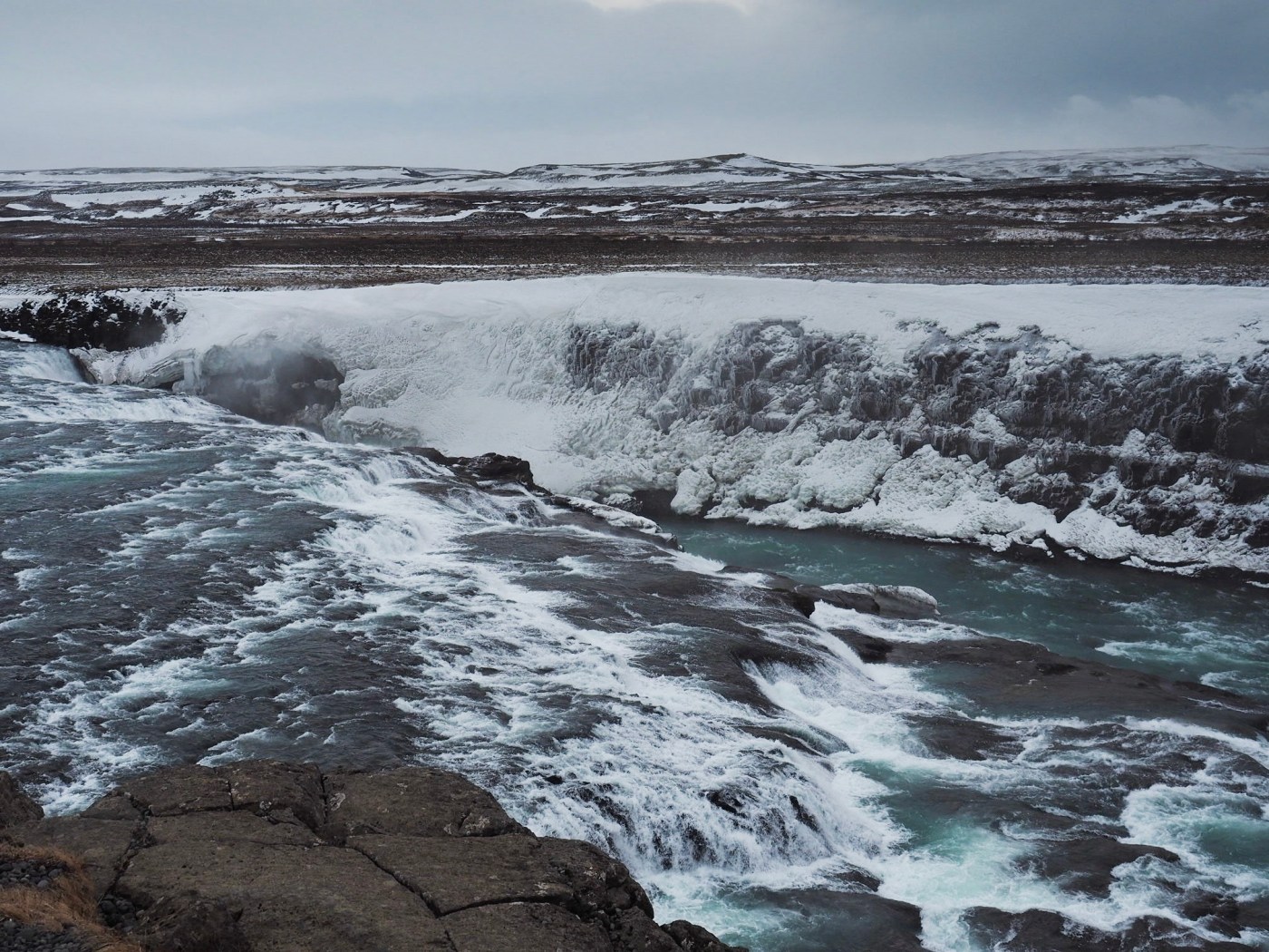 Once we couldn’t feel our hands any more, we headed back to the car, with Gullfoss our next stop, about 20 minutes away. The wind was howling by now and we put extra layers on and set off up to the waterfall. It’s the biggest waterfall I’ve ever seen! It’s difficult to tell from the photos. This has to be my most challenging day of photography. The wind was so strong we struggled to stand, and my tripod was in danger of blowing over! So much for long exposures, fast shutter speeds were essential!