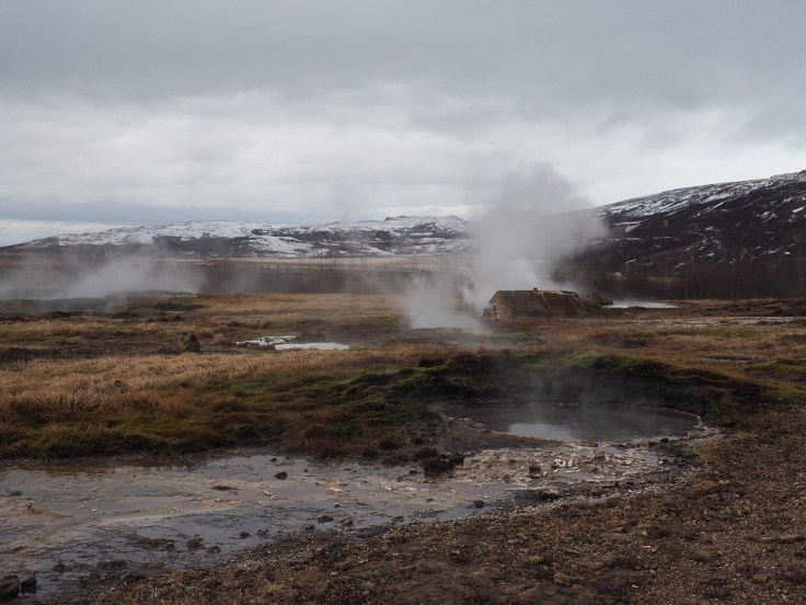 We got up early to try and beat the tourist buses. I hadn’t slept well anyway because of my cold. We packed some Skyr, blueberries and bananas for breakfast and set off. The landscape looks particularly barren at the moment because we’re here between seasons… the snow has mainly gone but the grass is still yellow and hasn’t turned green. After a 40min drive on empty roads, we arrived at the geysers. We knew we’d arrived because the fields were steaming.