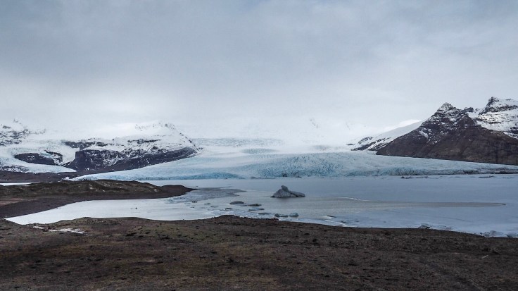 We’d been advised that this was a smaller, quieter version of Jökulsárlón. The view was lovely, over the lagoon towards the glaciers, which merge with the sky on this photo. However, I was disappointed because the lagoon was frozen and there were very few icebergs floating in it. I hoped Jökulsárlón was better.