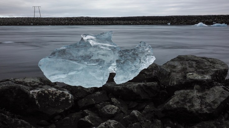 We walked along the river towards the beach as there seemed to be a lot of people there. It was amazing watching some icebergs flying along in the current, while others were stuck on rocks. I took some long exposure shots, pleased to be getting the sort of image I’d been hoping for. Some of the ice looked like jewels, clear, shining and stunning against the black rocks and sand.