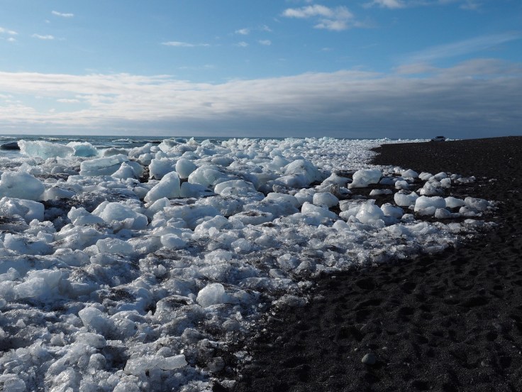 As we travelled east along the south coast, the road cleared, the weather improved and the speed John was driving at went up. When we reached Jökulsárlón the sun was shining and we couldn’t resist stopping there again. It looked quite different. The icebergs were smaller and less varied, but they shone beautifully in the sunshine.