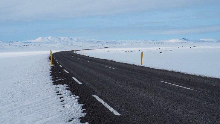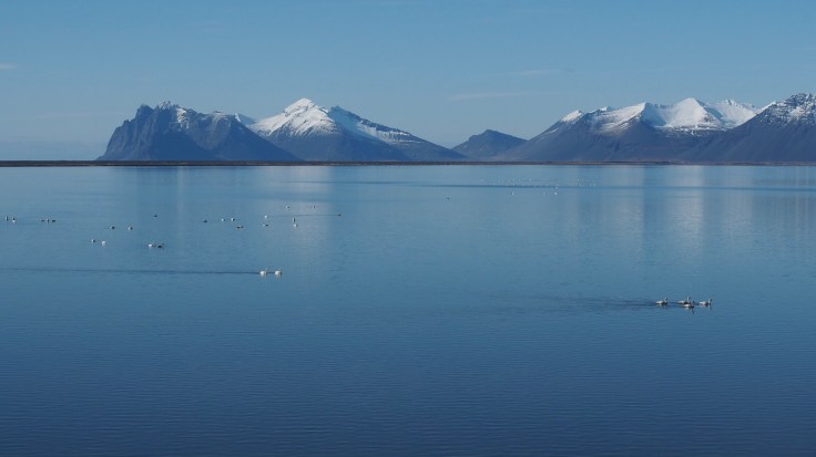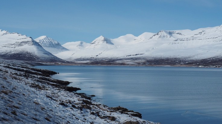 At a couple of junctions that we could potentially have taken to the next big town, Egilsstaðir, signs advised that the roads were closed. We carried on along the coast, until road number 1, the ring road we’ve been following, turned inland. Looking at the snowy mountains ahead (in the photo below), we wondered where the road was going.