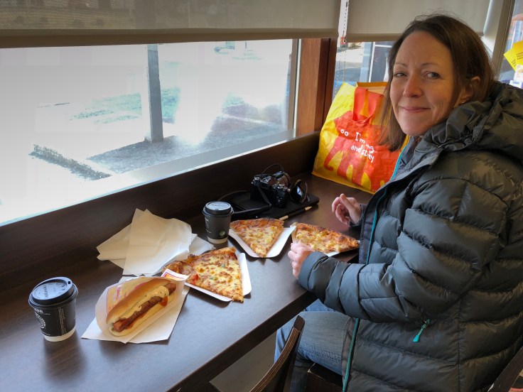 It turned out that there was a 6km tunnel though one of the mountains. From the exit of the tunnel it wasn’t far to Egilsstaðir, where we hoped to pop to the supermarket and find a cafe. Unfortunately, we’d forgotten that supermarkets might be closed on Easter Sunday, which might have explained the lack of open cafes too! We were pleased to find a petrol station with a convenience store and fast food, and filled up on pizza and hot dogs.