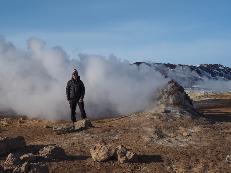 Dropping down again and getting nearer to Mývatn, the landscape became more like a moonscape, with grey and black volcanic rock showing between patches of snow. There was steam rising between the mountains.