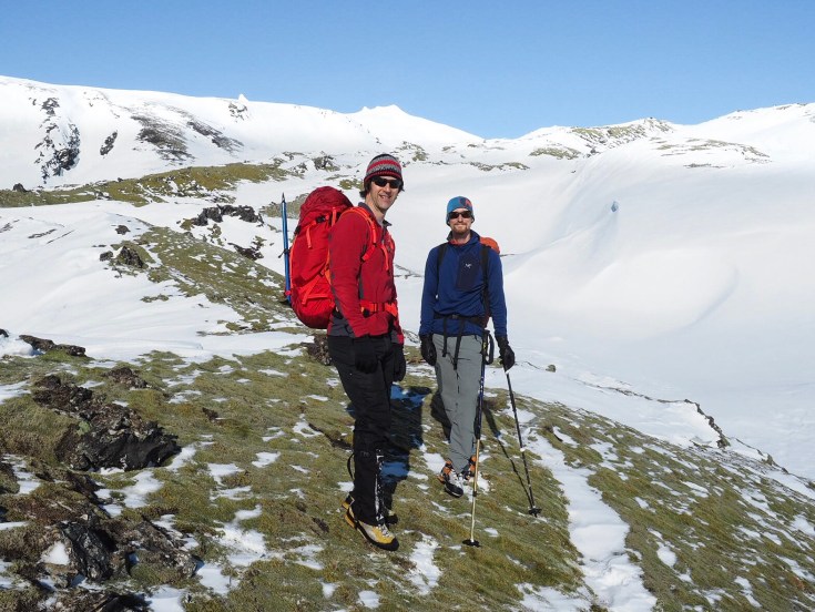 Walking became really difficult as we sank up to our knees in the snow with every step. Robbie went first to break the trail, then John went next to try and make it easier for me by treading down between Robbie’s footprints. I still found it really tiring though, like hour after hour of step ups in the gym. Our thighs were burning and we were also hot in the sunshine. For once there was no wind! After a couple of hours of this, we’d only got about half way up the mountain and I was worried that I wasn’t going to get the top, but we plodded on.