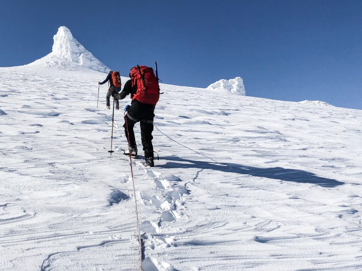 When we got to the base of the glacier, Robbie roped us up in case one of us fell into a crevasse. We kept trudging through the deep snow for a couple more hours, slowly getting higher. The rugged, rocks of the top of the mountain were just peeping over the ridge of the glacier, very gradually getting nearer.