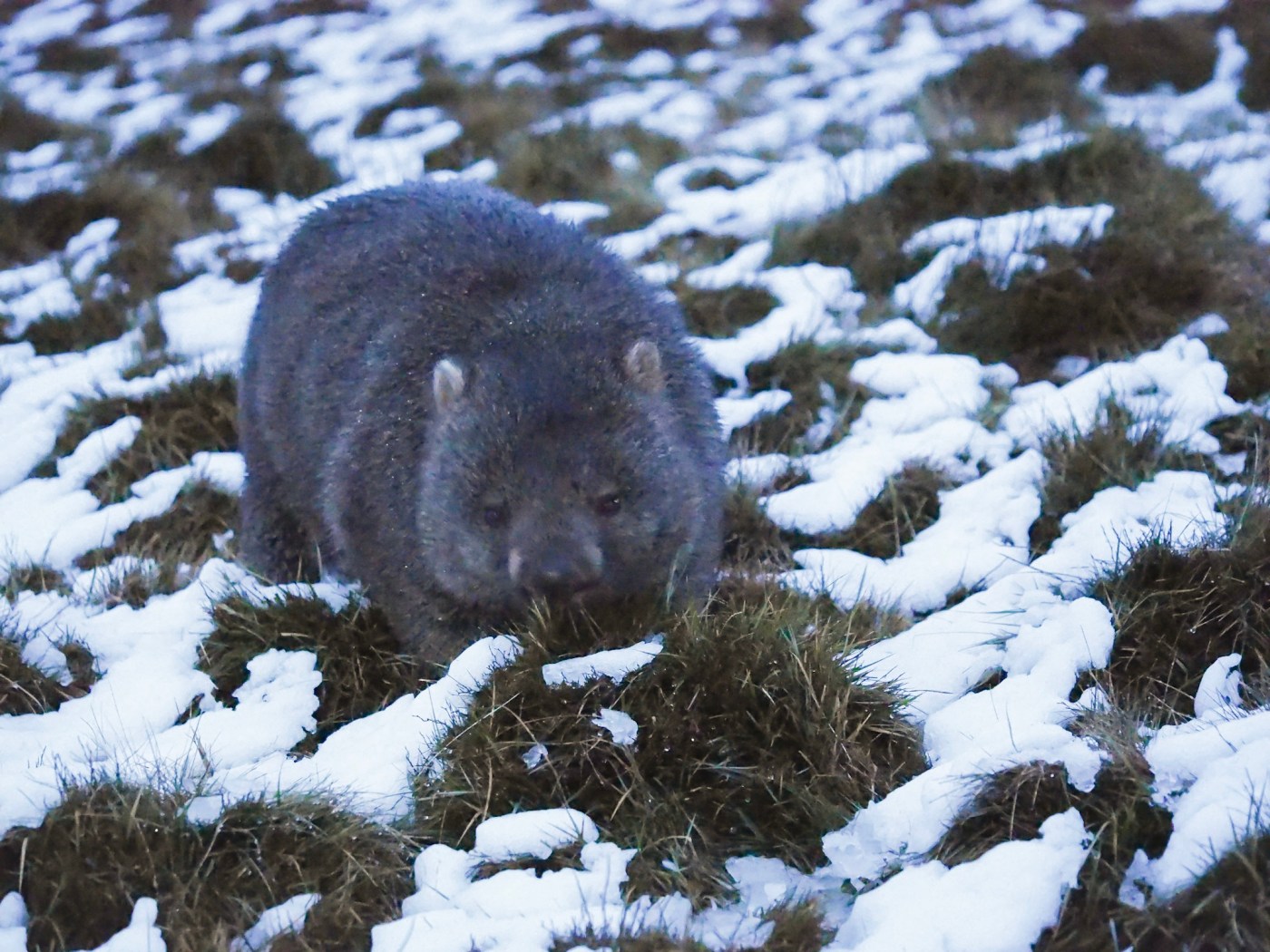 We parked up as it was starting to get dark and wandered up the board walk at the start of the Overland Track at Ronnie Creek. There was nobody else about and I admitted to being a bit scared of meeting wombats in the dark! We hadnt gone very far when we spotted our first wombat waddling up the hill not far away. When we looked around we saw several others too, a bit further away. By the time I got my camera out, they were a bit far away but John spotted one close to the board walk, in the distance. Once I agreed it was moving and wasn’t just a rock, we walked slowly and quietly towards it.