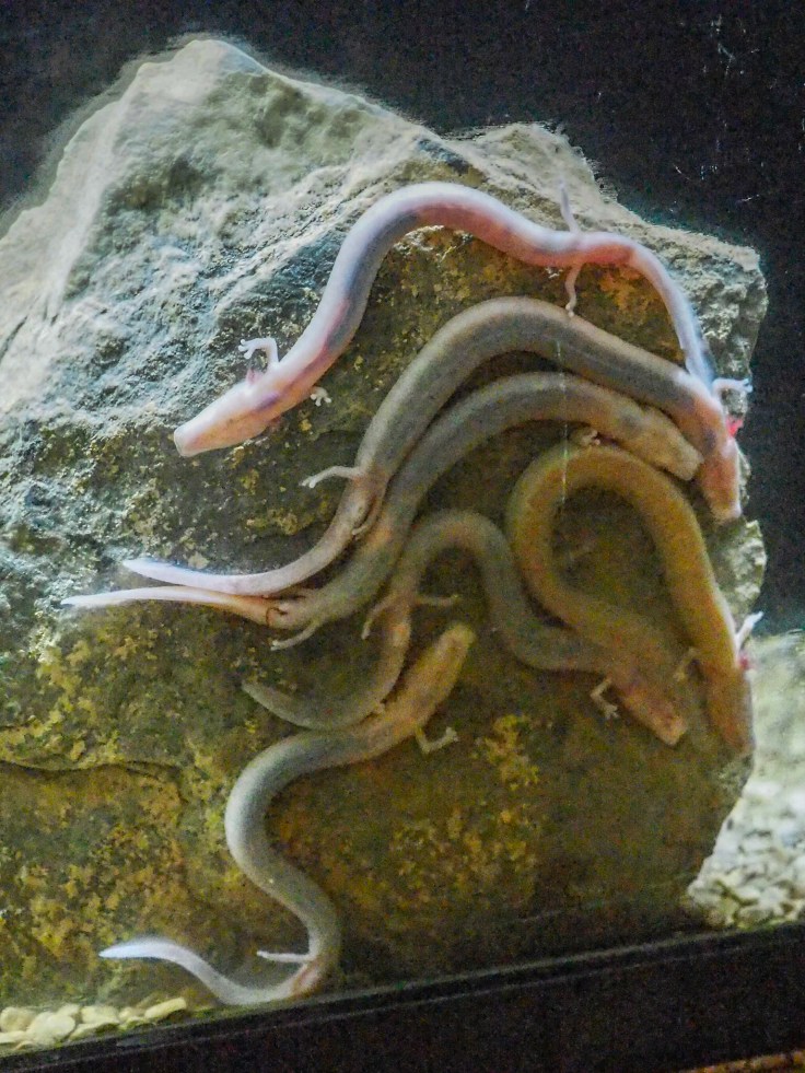 Inside the caves there are some proteus in tanks. These are depigmented amphibians with undeveloped eyes that have adapted to cave life. They are fed bloodworms twice a month. Yuk!