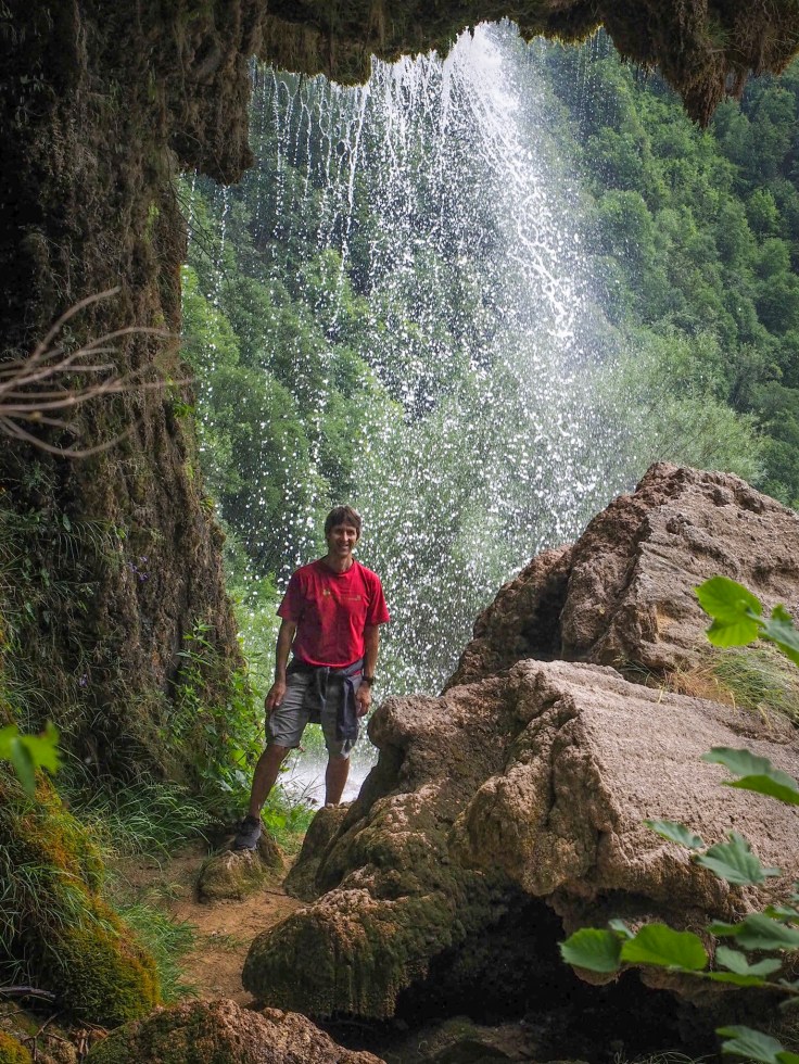 Back outside, it was now rather warm and sunny. We’d seen some signposts to a waterfall and a subterranean cave about 20 mins away, and decided to go for a walk. We could see the small waterfall in the distance, and crossed the stream above it, then turned off to visit the outer subterranean cave. We could see boats tied up which must be used to go further inside. The water was a beautiful colour.