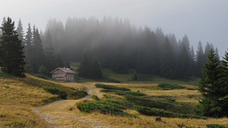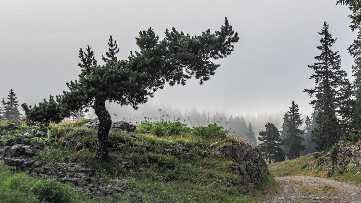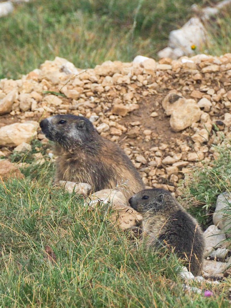 We knew we were on the right track when we came to another cabin, and our footpath crossed the long distance GR91. The path gradually got steeper and I was a bit worried whether I’d manage such along walk as I felt quite breathless. The first few days in the Alps always affect me like this as, coming from sea level, we’re not used to altitude. This mountain was twice as high as Snowdon or Ben Nevis. I was distracted by some marmots that, surprisingly, didn’t run off and hide in their burrow, but posed for a photo. It’s not great because the mist was so low making the image rather flat and hazy.