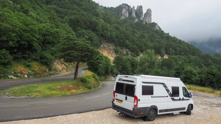 It rained all night. As we were parked under a tree (which was great when it was hot and I wanted the shade!) the rain was plinking and plonking on the roof all night… not very conducive to a good sleep. This morning, we took our time tidying the van and getting ready and, while we had hook up, I took the opportunity to charge all the devices and toothbrush, and to wash, dry and straighten my hair. Once everything was done, we set off for Col de Rousset, still in the rain.