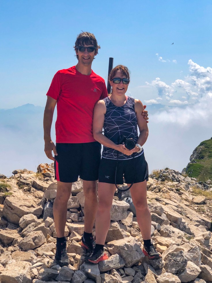 We sat down on bench made from some rocks and an old plank, while we each had a bar of chocolate and some water. Then John took some people’s photo and, in return one of them took ours. After enjoying the views for a while, we started to head back down to a second col further along the ridge. The path zig zagged down and we were soon there.