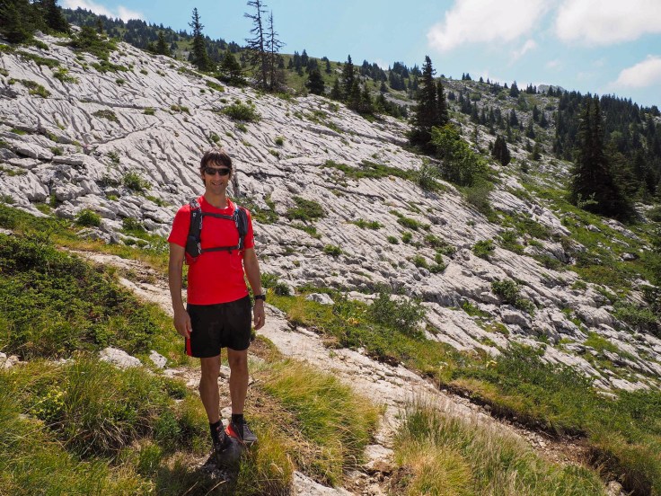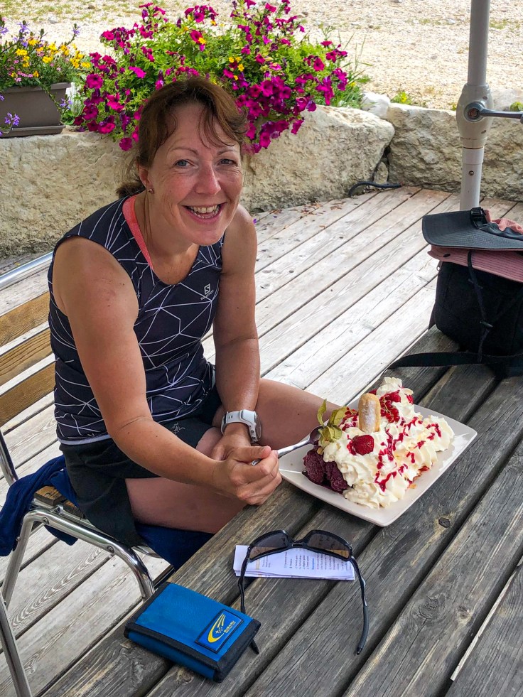 From the col, the path continued steeply down though the limestone, over rocky paths back into the forest. I was glad of the shade because it was quite hot out of the breeze, and even more glad when we reached the refuge. I chose an ice cream from the menu, along with a Diet Coke. When the waiter brought it out, everyone turned and stared. It was massive! When John’s arrived shortly afterwards, we were the source of some amusement as everyone watched to see if we would manage to eat them. Maybe the cost of 11 euros each should have given us some idea that each ice cream was big enough for two! They were lovely though. I didn’t quite finish mine but, refusing to be defeated in front of the watching French, John finished it for me!