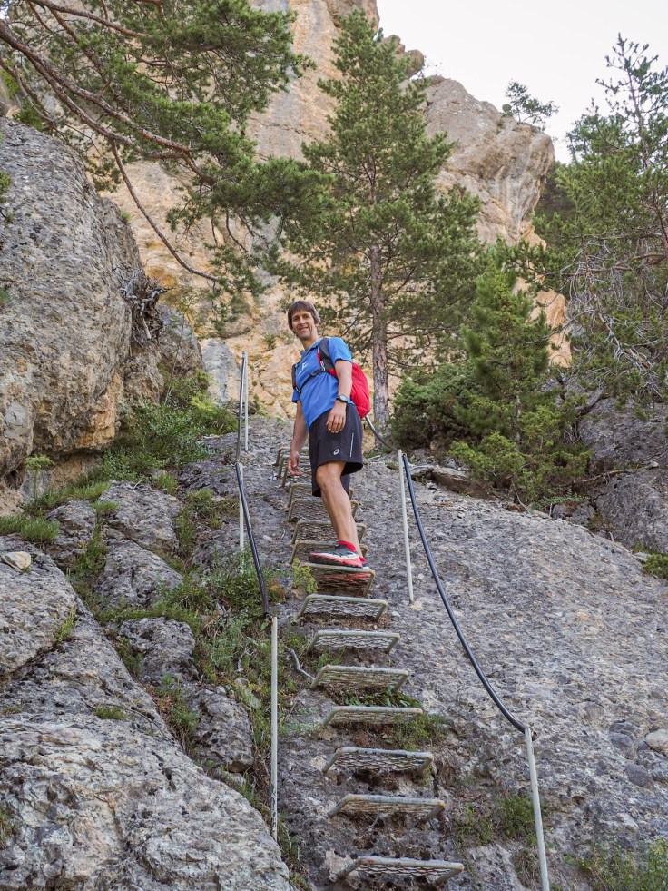 After eating our breakfast and using the compost toilet, we grabbed our rucksacks and set off uphill through the forest. Luckily, the side of the valley we were climbing was in shade for much of the morning. We soon reached a series of ladders and cables where the track became steeper and rockier, which were fun. The views over the valley below were fantastic.