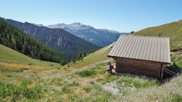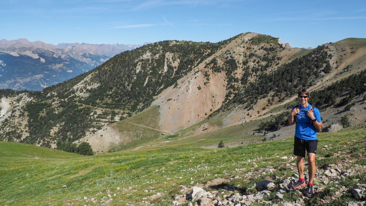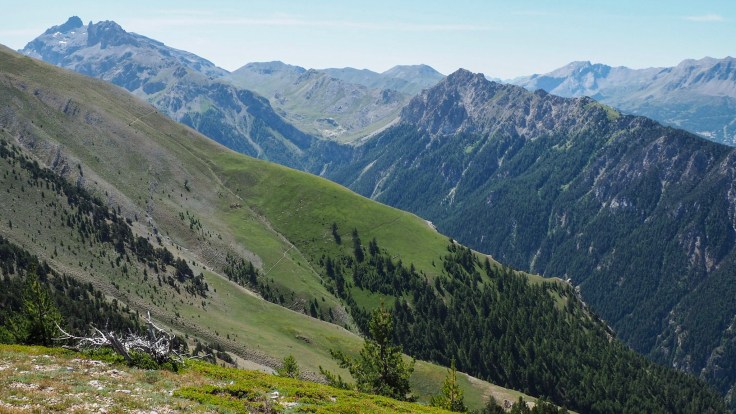 We took a right fork at a junction to loop up to the Agnes ridge, which Cugulet is on, and could see our path back around the hill in the distance, passing a mountain cabin. It was getting very hot already and when we came out of the trees into open pasture and plodded uphill, I had to keep stopping to get my breath and cool down. Finally, after a few hours we reached the col on the ridge, with magnificent 360 degree views over the Ecrins and Queyras mountain ranges.