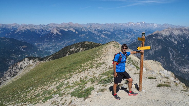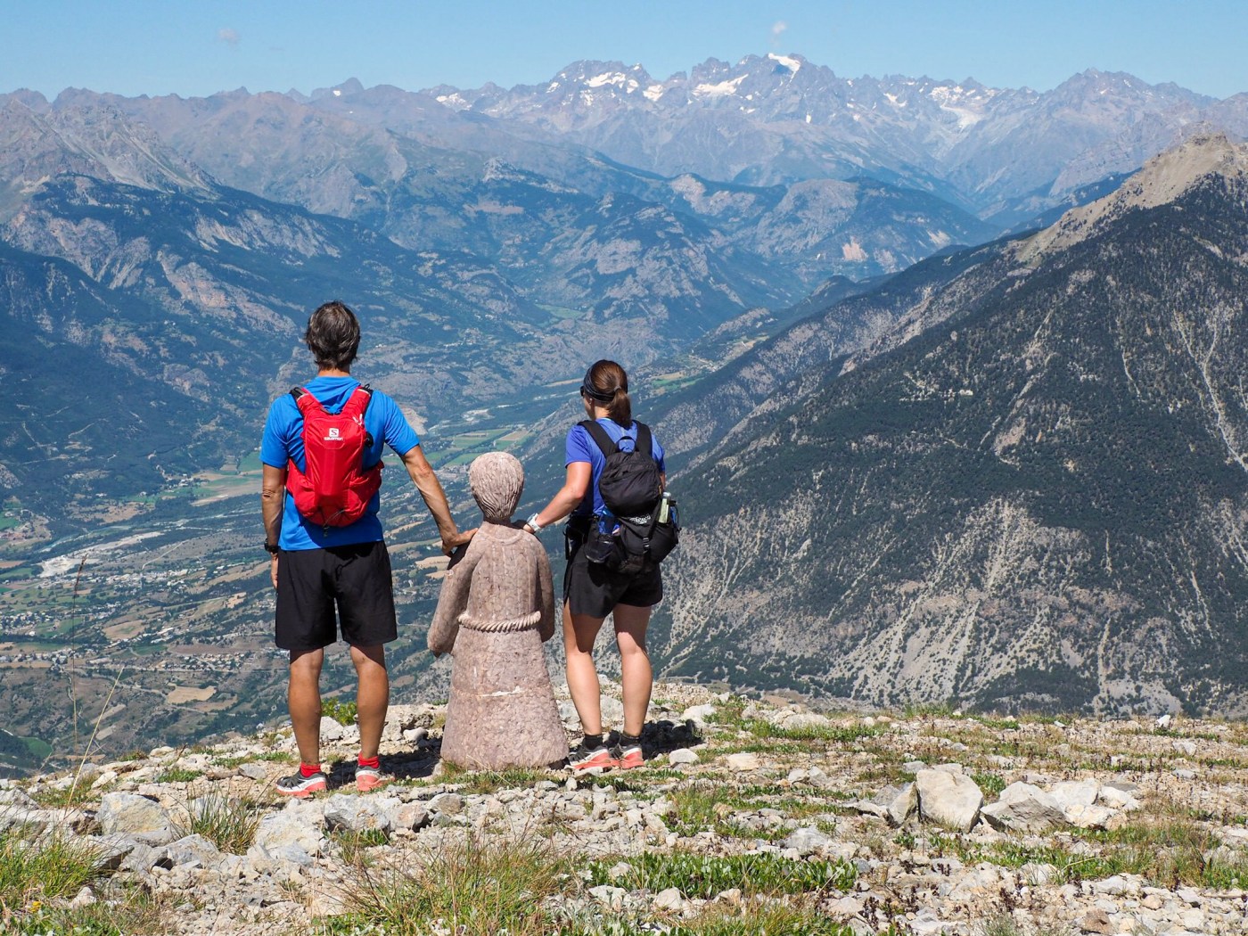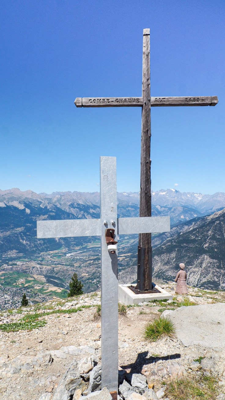 We then continued along the ridge to Combe Chauve (2483m), high above Guillestre, with great views over the town, Mont Dauphin, the campsite and beyond. There are two crosses and a pink marble statue on the top. We were pleased to have the peak to ourselves before a couple of other people arrived. We’ve been amazed how quiet the hikes are.
