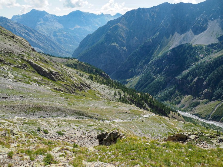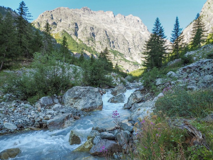 The path up the Vallon de la Sele starts gradually uphill through the forest, along the Celse Niere torrent. It was shady at this point, and nice and cool. However, after about 40 minutes we emerged from the trees into a more rocky landscape, where it was hotter, even though it was still early in the morning. There were wild raspberries, bilberries and juniper growing alongside the path.