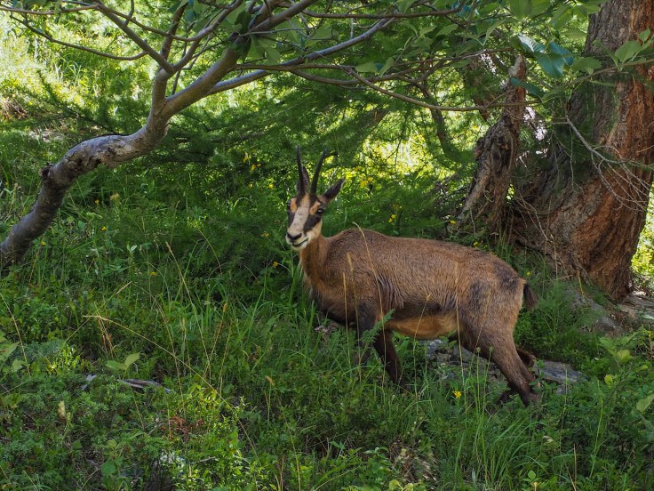 The path zigzagged uphill steadily and wasn’t as difficult as some of the others we’ve hiked this week. We were pleased to come across a chamois, eating close to the path. It didn’t seem to be afraid of us and let us watch it for a while before moving off into the trees. Lovely to see!