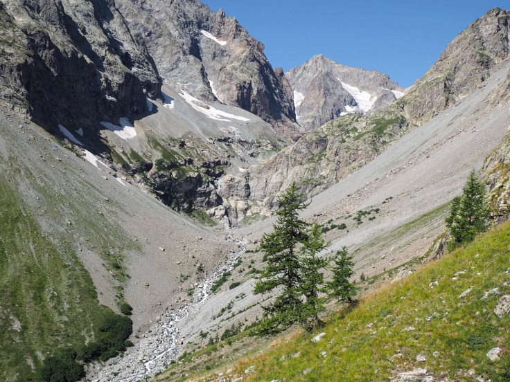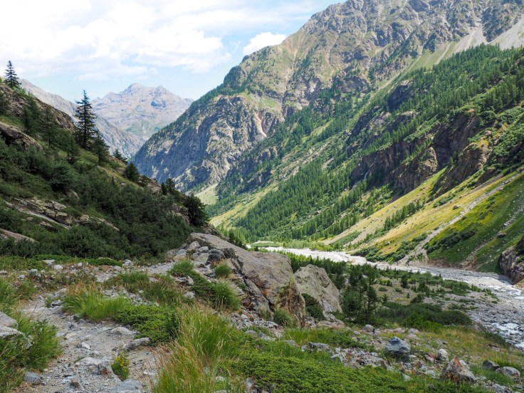 We set off to walk up to one off the refuges in the Sele valley, at this point undecided which. Refuge du Sele is lower (2511m) but sits on a wall of rock, accessed by a series of fixed cables. The guidebook notes that a head for heights is needed. This sounded fun but also scary! Refuge du Pelvoux is higher (2704m), but the route is less difficult.
