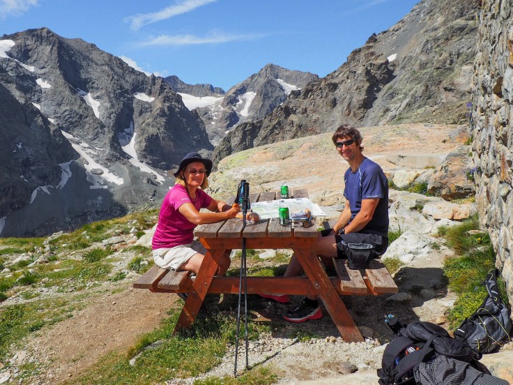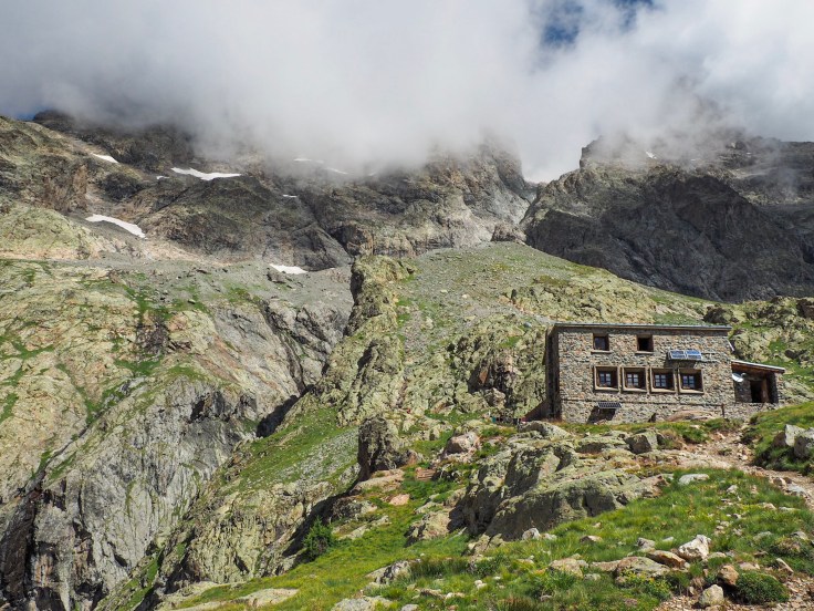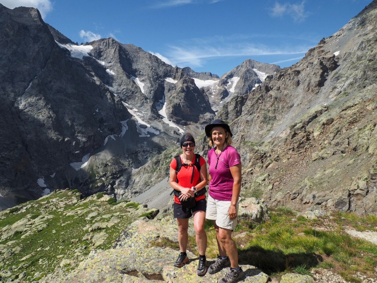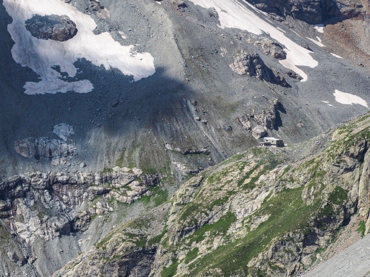 The path wound backwards and forwards around the mountainside, gaining height and getting more and more rugged. It was very hot now and the climb felt more difficult. The views were amazing though, and well worth the effort. Although we could see Refuge du Sele, Refuge du Pelvoux was hidden. Finally, we were surprised to see it pop up right ahead of us! Great!